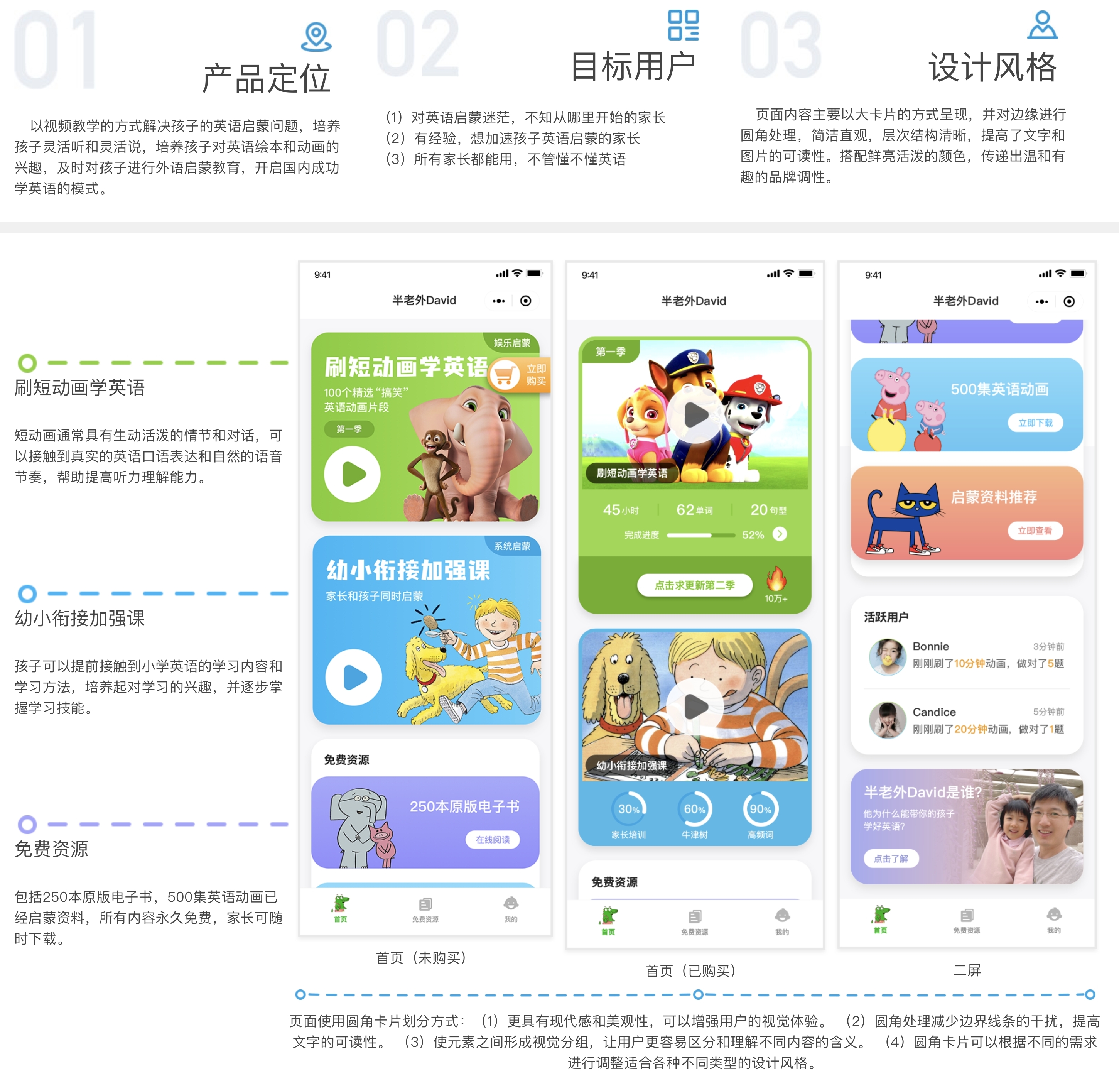 舉例來說,我們曾為一個名為“半老外 David 英語啟蒙”小程序參與界面與交互設(shè)計。在這個面向兒童與家長的英語學(xué)習(xí)產(chǎn)品中,為了提高用戶體驗我們進行視覺調(diào)整: