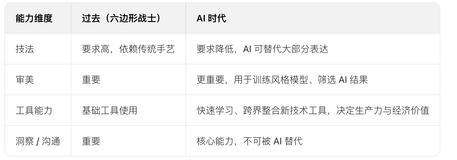 現(xiàn)在:“AI” 木板已達(dá) 100 米,而審美、洞察等其他木板僅 5 米,后者成為能力瓶頸,需重點(diǎn)補(bǔ)齊。