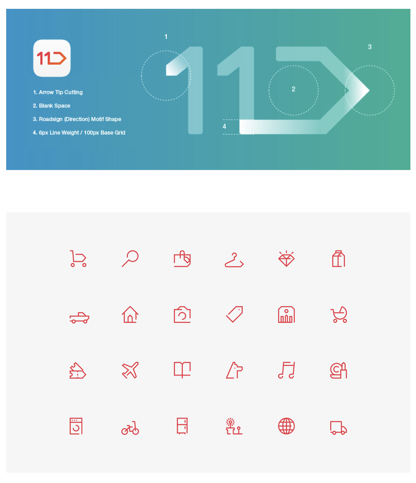 - 案例 1:韓國電商 “11 街” 的功能圖標(biāo)延續(xù)了 logo 的圖形特點(diǎn),區(qū)別于競品,增強(qiáng)用戶認(rèn)知。