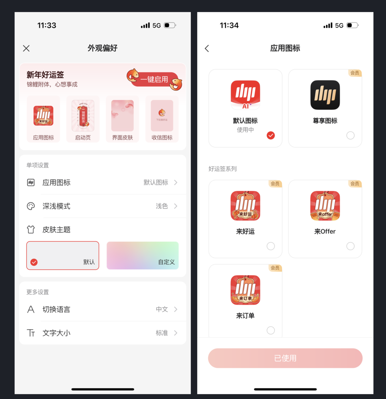 更貼心的是,這些設(shè)置都支持 “單項(xiàng)調(diào)整”—— 比如用戶只想換圖標(biāo),不用連帶改皮膚;想調(diào)文字大小,也不用重新設(shè)置模式。這種 “精細(xì)化自定義”,讓用戶感覺(jué) “這個(gè) APP 是為我量身定制的”,不僅降低了審美抵觸,還悄悄提升了用戶對(duì)產(chǎn)品的好感度。