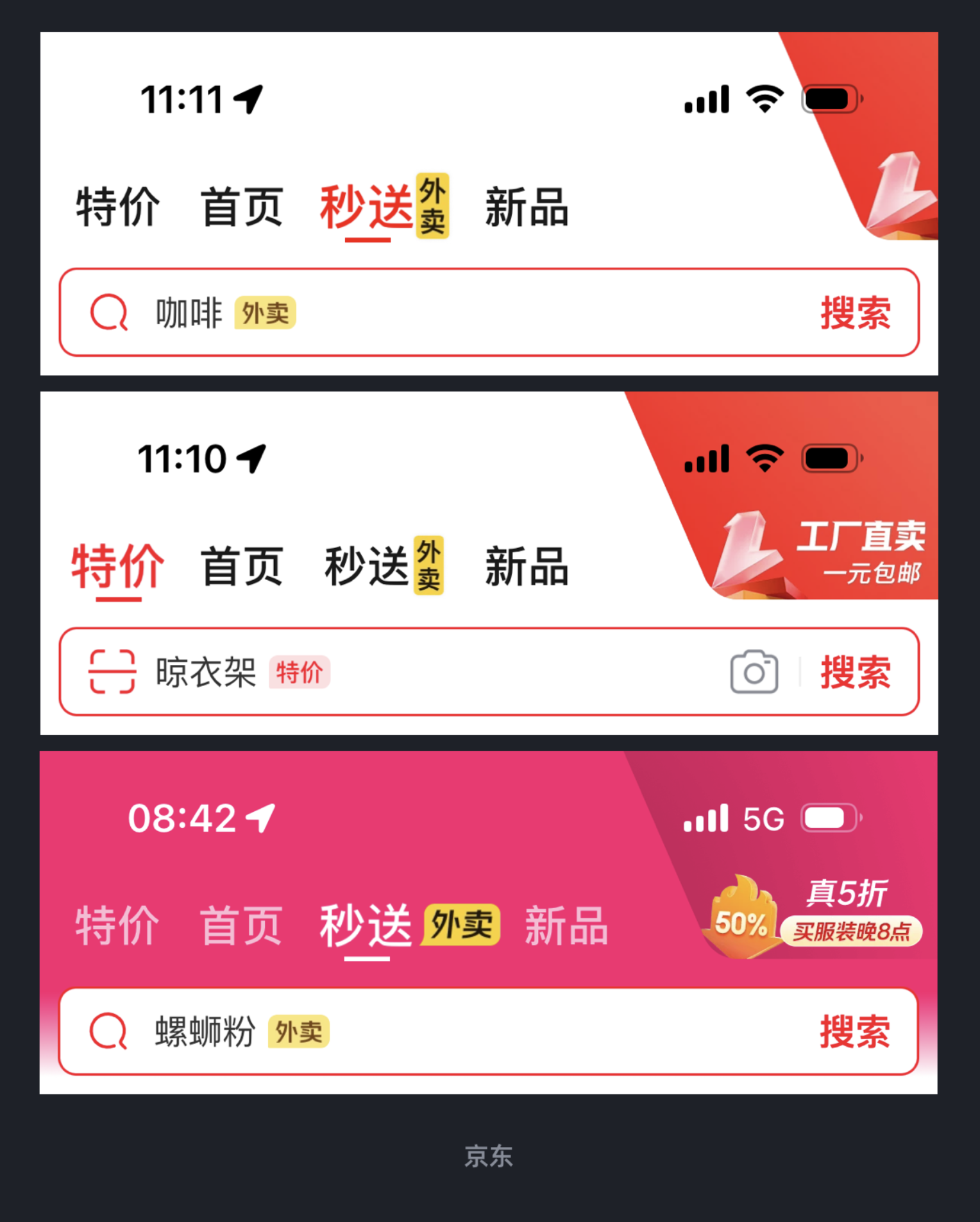 之前京東外賣還沒(méi)加入 “秒送” 欄目時(shí),導(dǎo)航欄的布局有些失衡:左側(cè)是 “特價(jià)”“首頁(yè)” 等功能入口,右側(cè)只有搜索框,中間和右側(cè)有不少空白。后來(lái)京東把外賣業(yè)務(wù)納入 “秒送” 欄目,在導(dǎo)航欄右側(cè)加了一個(gè) “外賣” 營(yíng)銷入口 —— 這個(gè)小小的改動(dòng),不僅讓導(dǎo)航欄左右布局更對(duì)稱,還充分利用了之前的空白區(qū)域,拓展了營(yíng)銷接口。用戶點(diǎn)進(jìn) “外賣” 就能直接下單,不用再?gòu)氖醉?yè)層層尋找,既提升了轉(zhuǎn)化,又讓界面更規(guī)整。