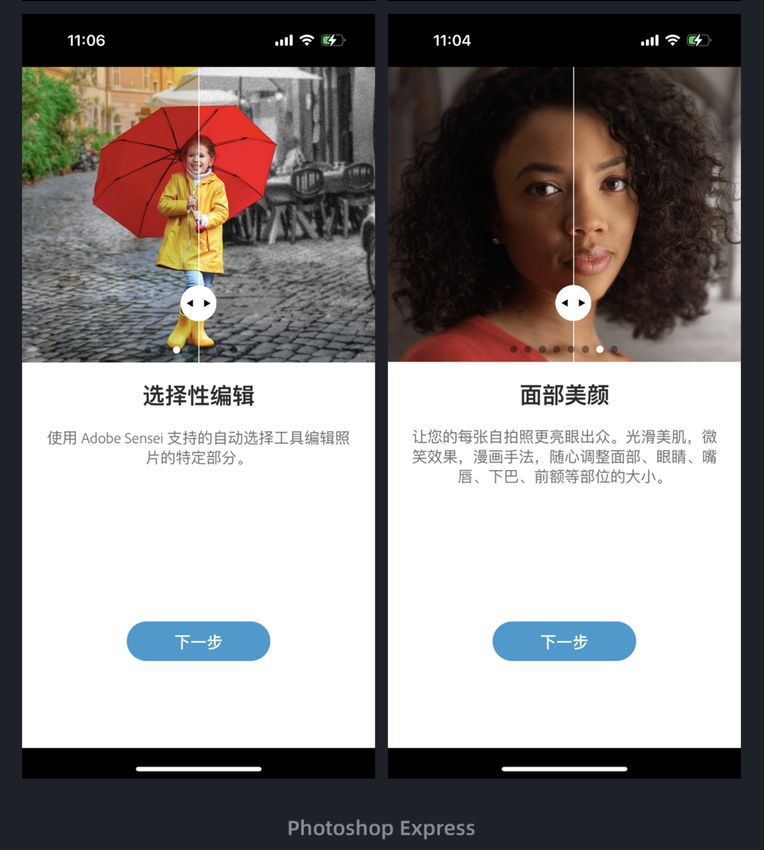 很多產(chǎn)品的引導(dǎo)頁(yè)、功能介紹,都喜歡用 “靜態(tài)圖文”,用戶看了容易忘,也感受不到功能的實(shí)際價(jià)值。但 Photoshop Express 的引導(dǎo)頁(yè)設(shè)計(jì),卻用 “互動(dòng)” 讓功能優(yōu)勢(shì)變得直觀 —— 用戶不用 “看說(shuō)明”,而是 “親身體驗(yàn)”。