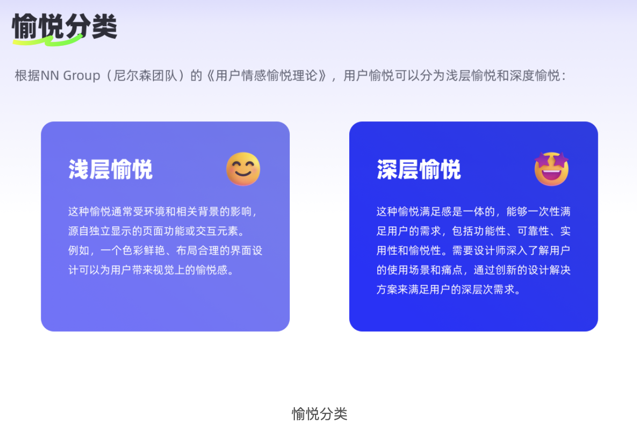 根據(jù)尼爾森團隊的《用戶情感愉悅理論》,設計帶來的愉悅感分為兩種,二者的價值和實現(xiàn)方式截然不同,混淆它們很容易讓設計 “浮于表面”。