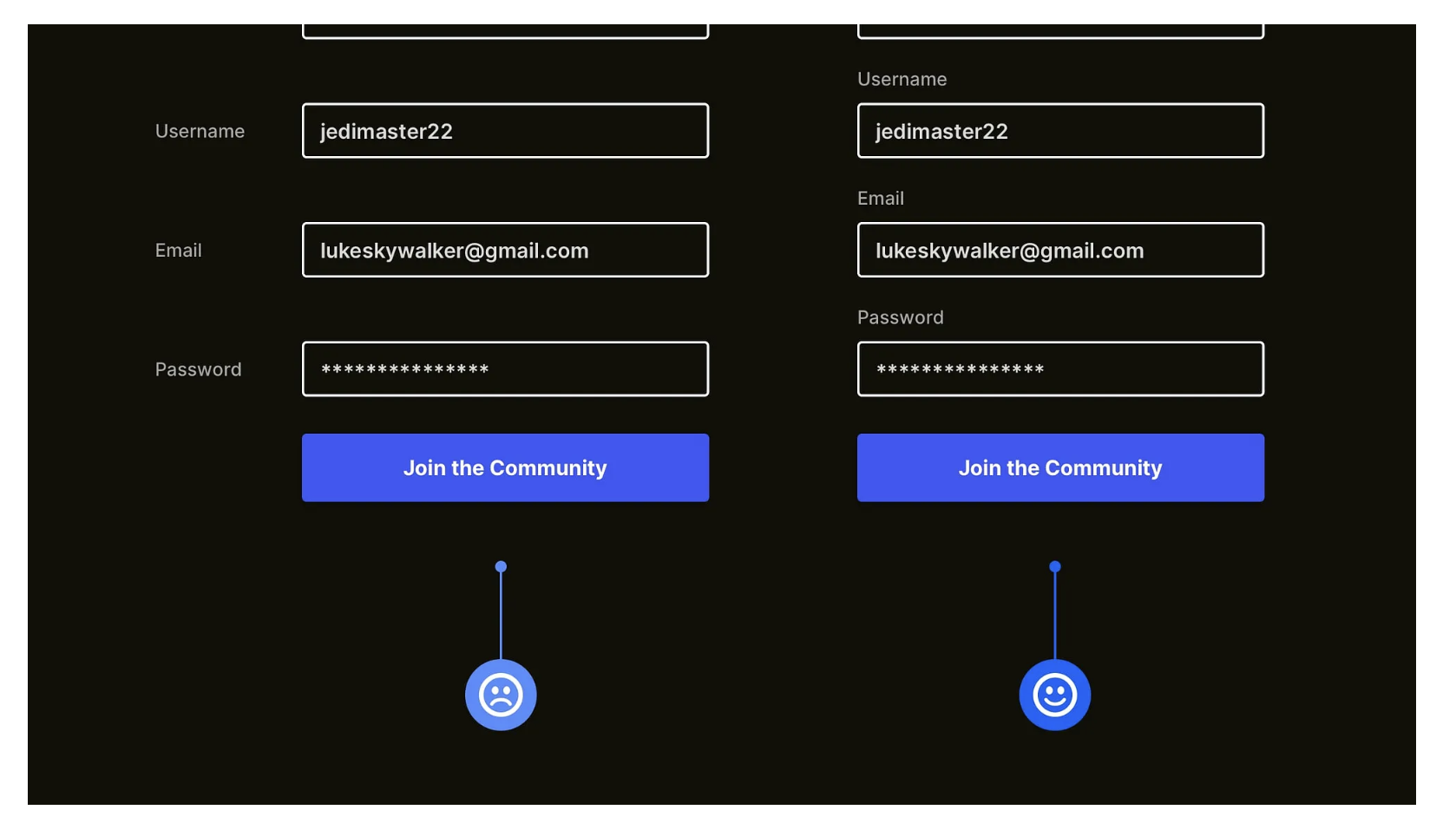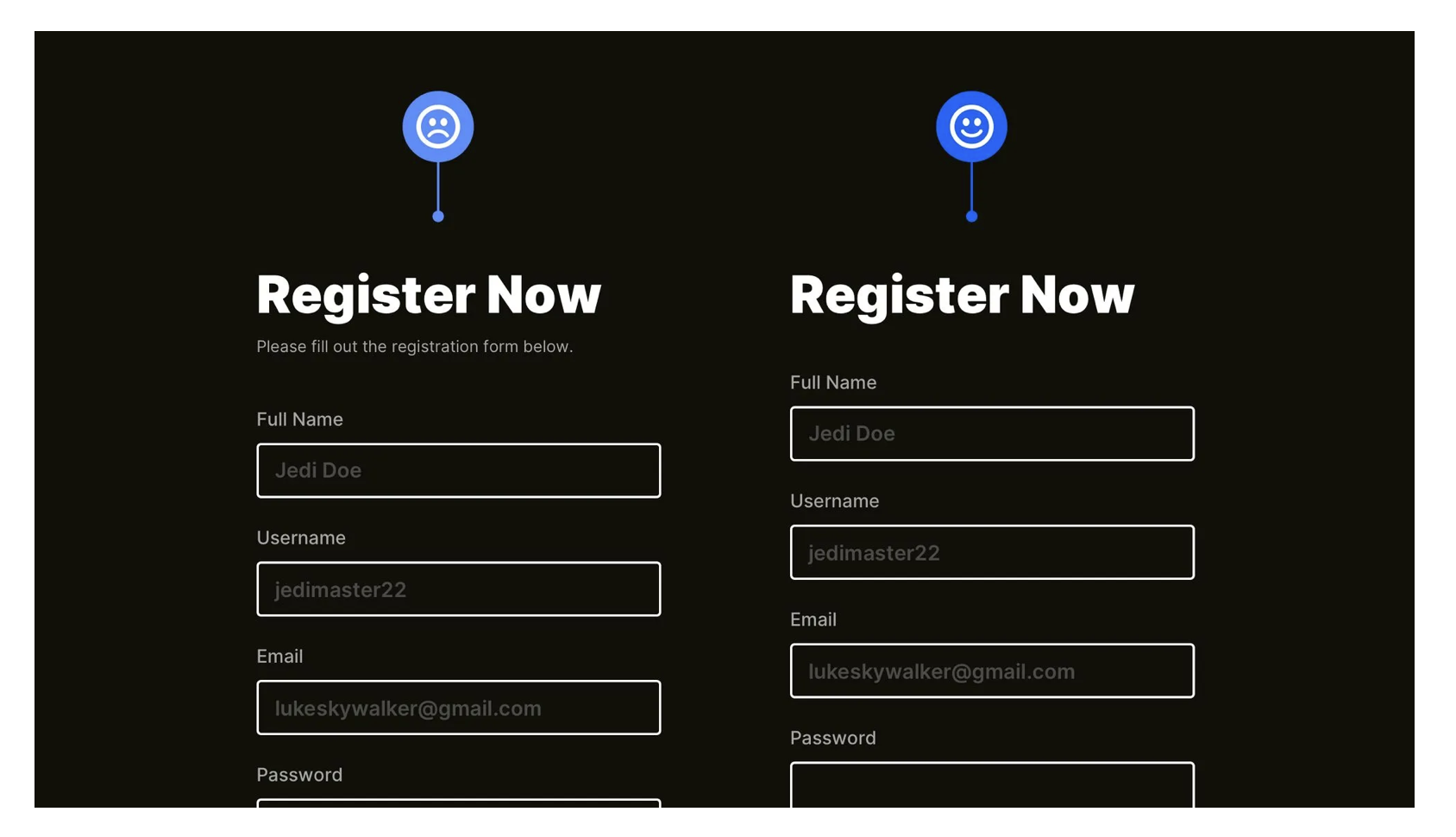 很多產(chǎn)品用 “紅色邊框” 提示表單錯(cuò)誤,但這種設(shè)計(jì)對(duì)色盲用戶(hù)無(wú)效 —— 他們無(wú)法分辨 “紅色” 與其他顏色,會(huì)完全忽略錯(cuò)誤提示,導(dǎo)致反復(fù)提交失敗。