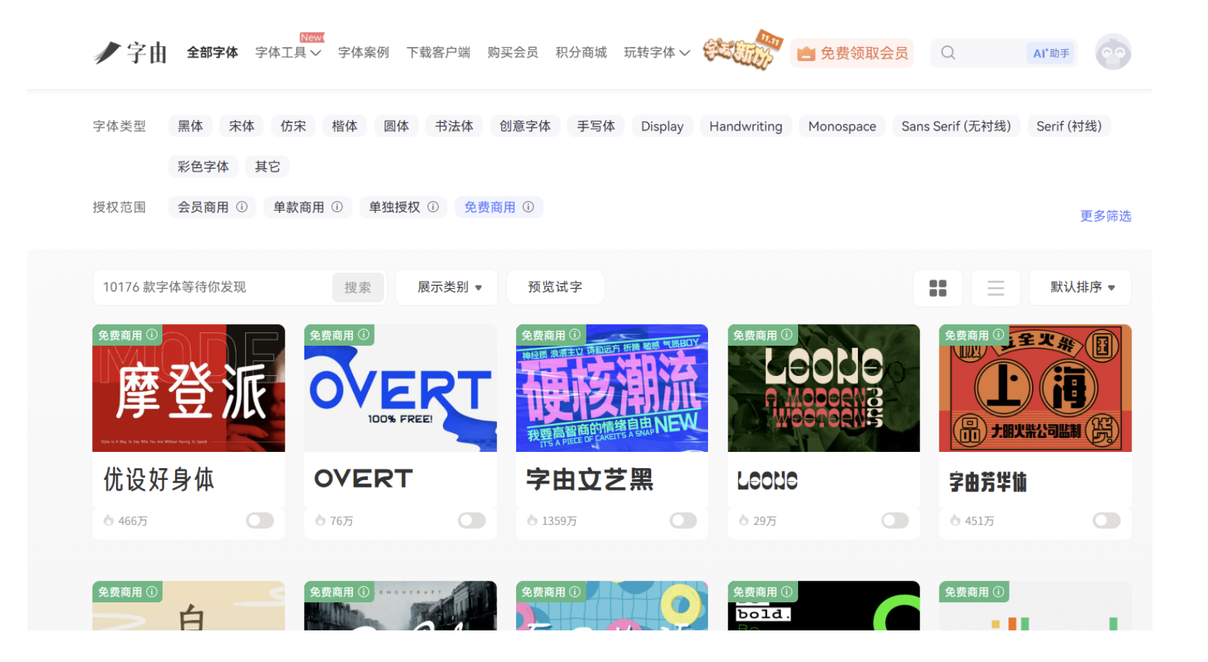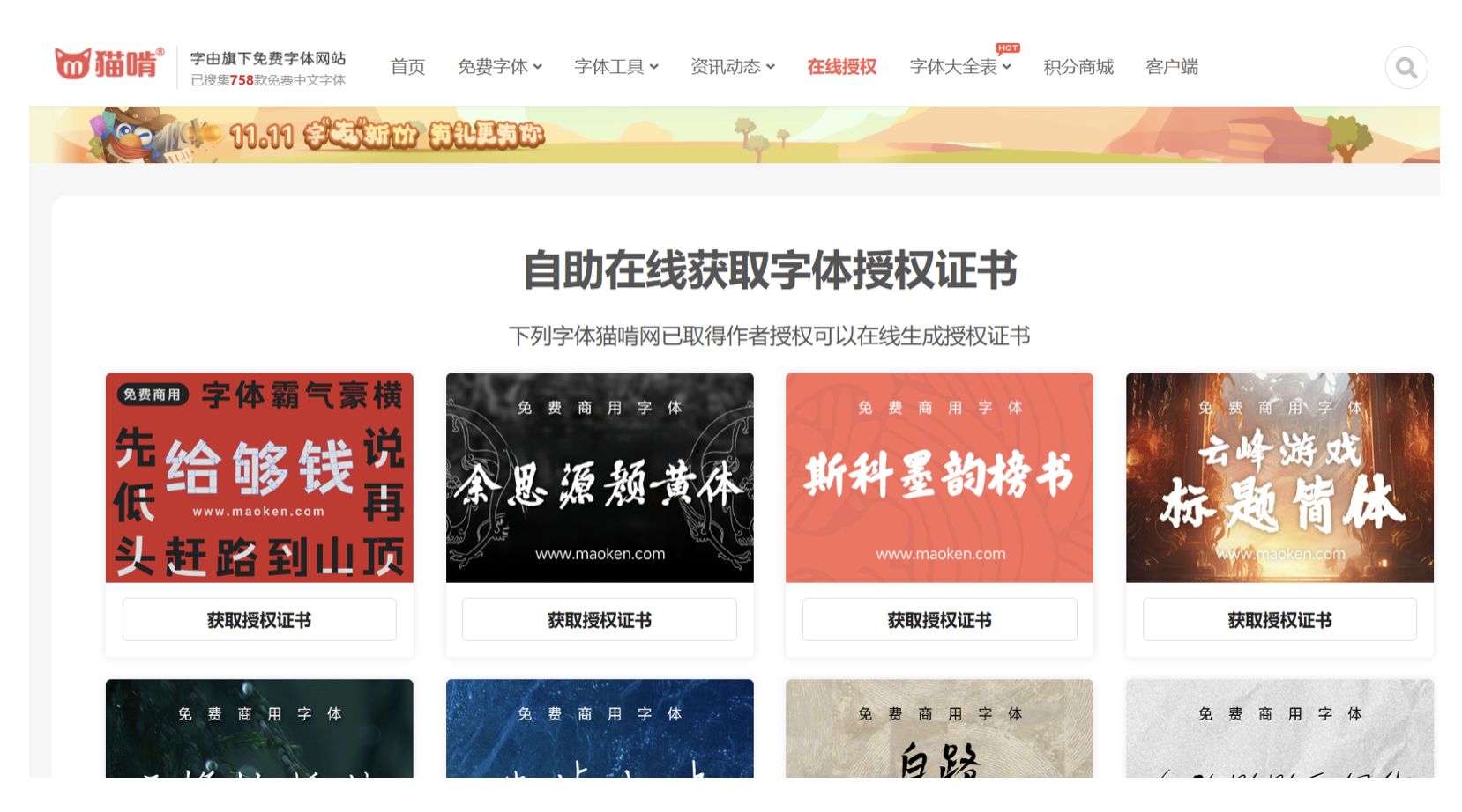 專注于中文字體的貓啃網(wǎng),是個人設計師和小型工作室的福音。平臺已搜集 758 款免費商用中文字體,更新頻率高,經(jīng)常能挖到新發(fā)布的優(yōu)質(zhì)字體,冷門小眾款也能在這里找到。