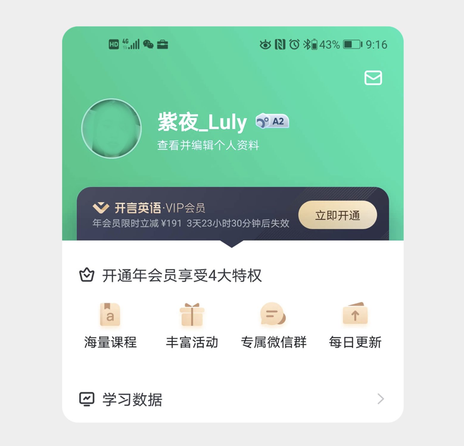 開言英語的 VIP 會員開通頁面,以簡潔有力的形式感突出核心價值。頁面聚焦 “年會員限時立減” 的優(yōu)惠信息,用醒目字體強(qiáng)調(diào)折扣力度和時效,瞬間抓住用戶注意力。