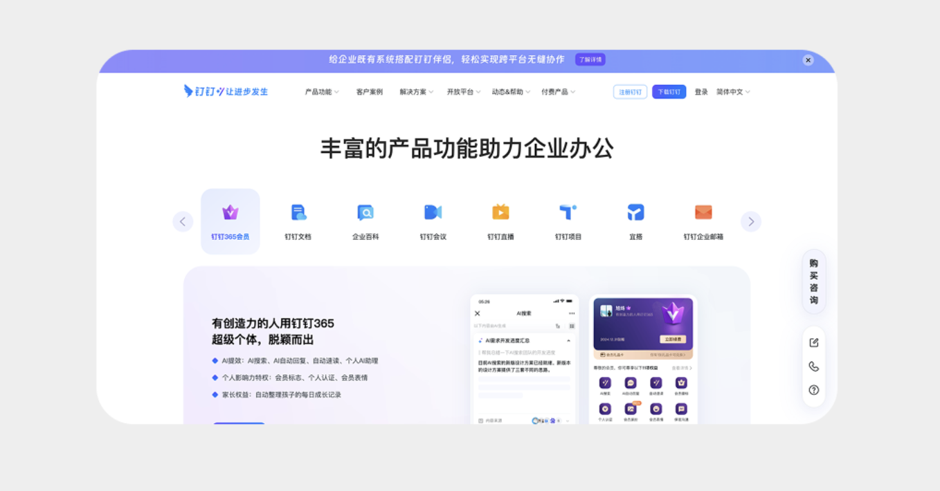 將圖標(biāo)與文字上下排版,搭配圓角矩形背景標(biāo)識選中狀態(tài),既能提升頁面豐富度,又能讓用戶快速識別功能。這種設(shè)計(jì)在工具類、辦公類產(chǎn)品中尤為適用,比如釘釘?shù)墓δ軜?biāo)簽頁,用簡潔圖標(biāo)搭配 “釘釘文檔”“企業(yè)會議” 等文字,既清晰傳達(dá)功能,又讓界面更具設(shè)計(jì)感,降低用戶認(rèn)知成本。