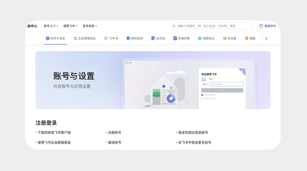 在標(biāo)簽欄兩側(cè)添加左右箭頭,點(diǎn)擊即可展示更多標(biāo)簽,適合功能模塊較多的 B 端產(chǎn)品或網(wǎng)頁。比如飛書的幫助中心頁面,標(biāo)簽頁涵蓋 “智能助手”“云文檔”“視頻會議” 等多個功能,通過左右箭頭切換,既保證界面整潔,又能完整呈現(xiàn)所有選項(xiàng),不影響用戶操作流程。
