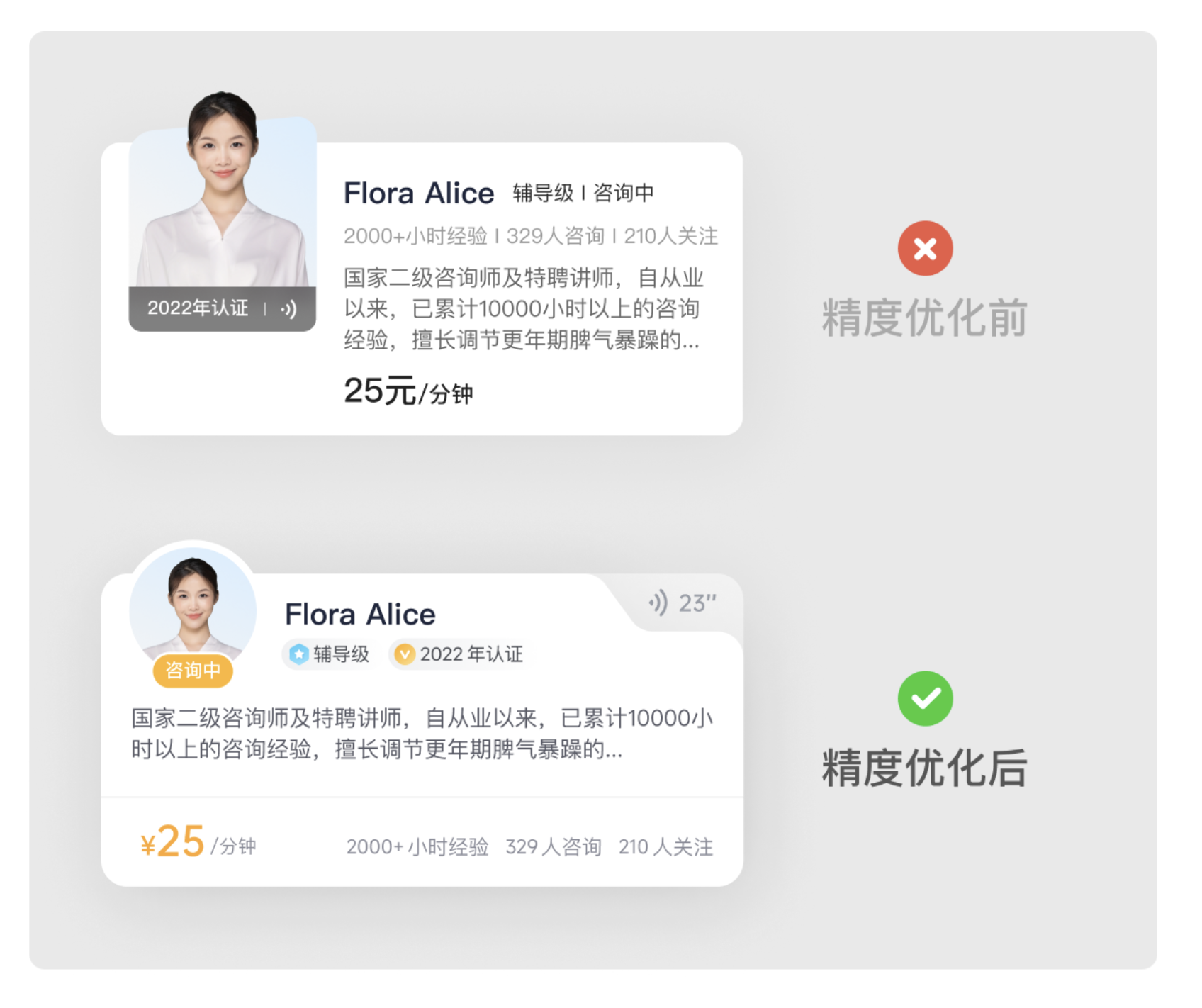 卡片中的關鍵數據(如咨詢費用、經驗時長、咨詢人數)需要重點突出,但要避免多個視覺焦點沖突??蓪①M用 “25 元 / 分鐘” 改為 “¥25 / 分鐘”,放大字號并加粗;其他數據保持統(tǒng)一字號,用間距區(qū)分,讓用戶一眼就能捕捉到核心信息,提升決策效率。