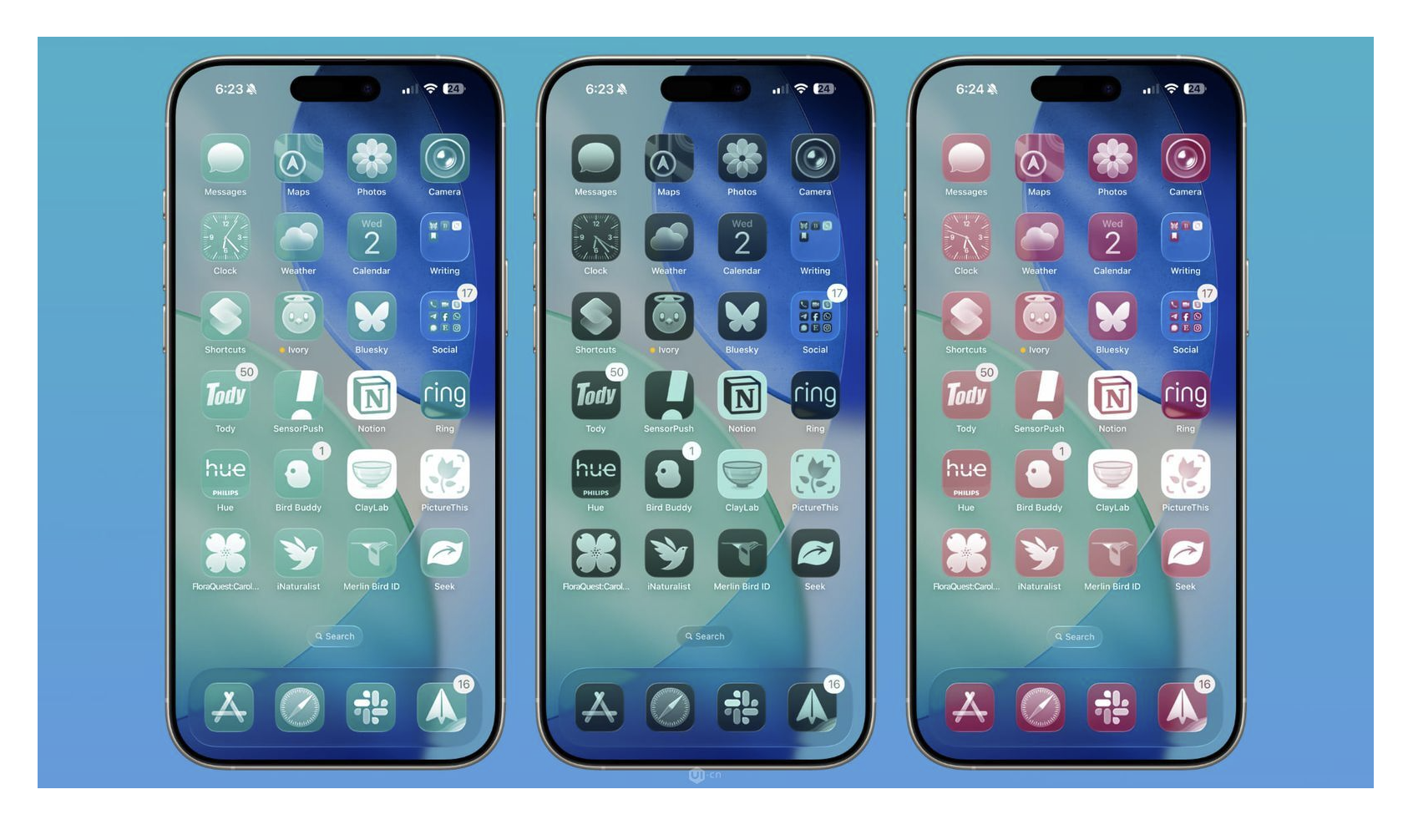 圖標(biāo)系統(tǒng)迎來重大升級,除了默認(rèn)、深色、有色三種樣式,新增的 "清除圖標(biāo)" 堪稱點睛之筆。這種圖標(biāo)完全透明,直接借用壁紙顏色,僅以上方的白色圖形標(biāo)識功能,搭配 "淺色(磨砂玻璃質(zhì)感)" 和 "深色(有色玻璃質(zhì)感)" 兩種選項,讓桌面風(fēng)格既能極簡純粹,又能與壁紙形成巧妙呼應(yīng)。
