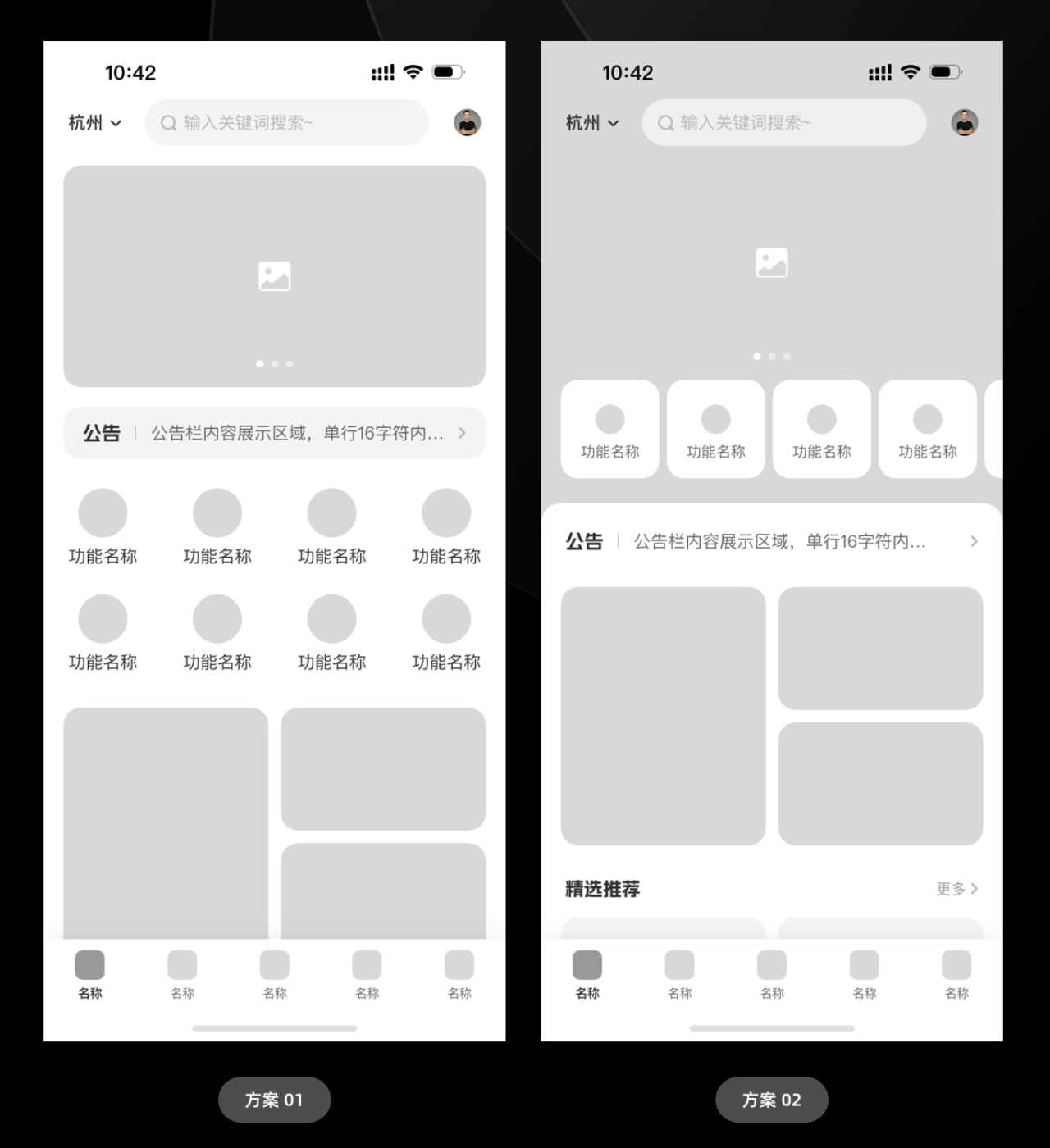 - 方案 01:突出 3 個核心功能(如購物車、訂單、優(yōu)惠券),采用大尺寸圖標 + 強色彩對比,其余功能小尺寸并列