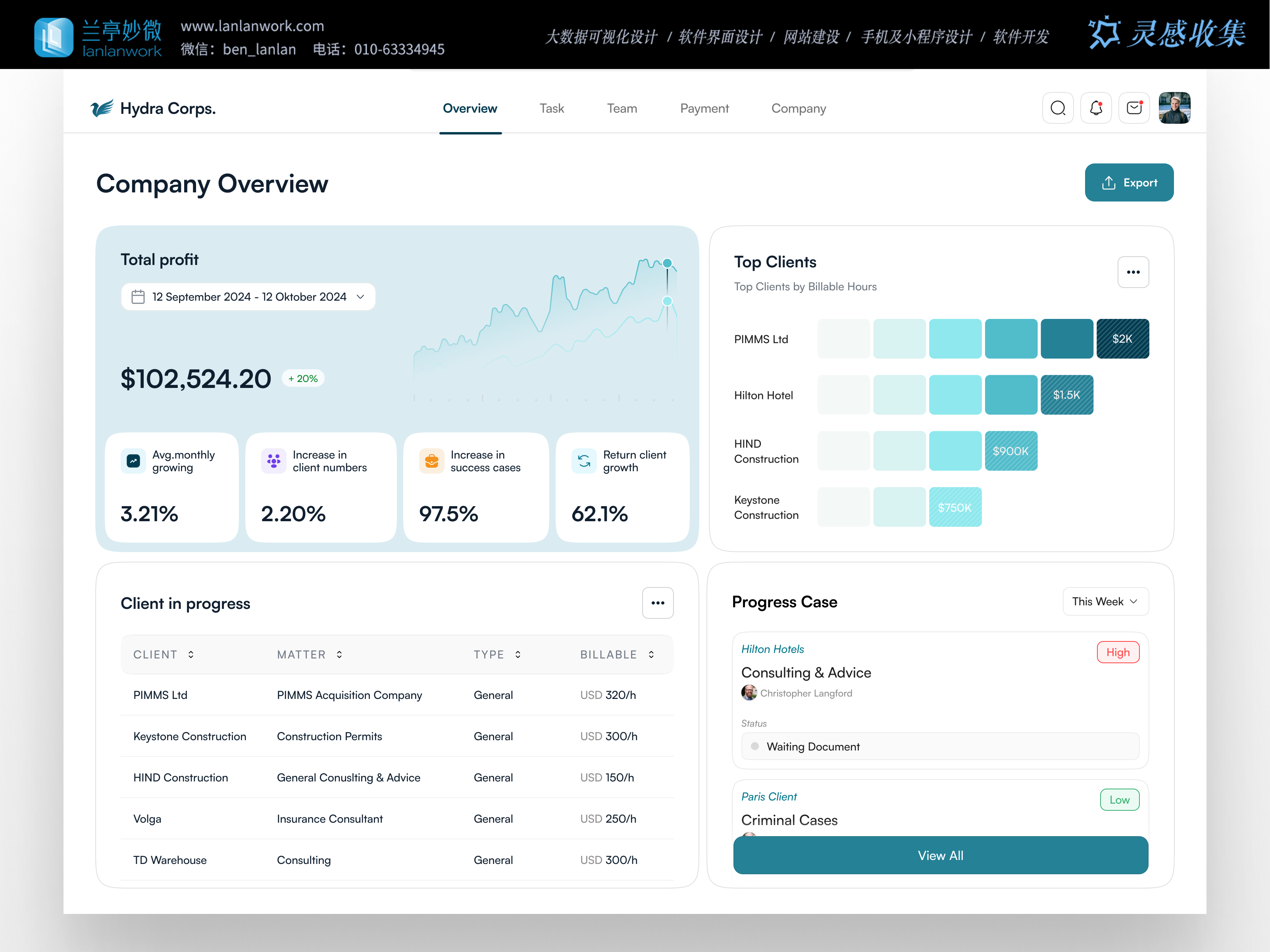 當(dāng)企業(yè)管理系統(tǒng)還困在 “表格堆砌” 與 “功能冗余” 的刻板印象中時,蘭亭妙微為 Hydra Corps. 打造的企業(yè)看板界面,用「極簡信息層級」與「商務(wù)柔色美學(xué)」,把復(fù)雜的企業(yè)運(yùn)營數(shù)據(jù)轉(zhuǎn)化為 “決策者一眼讀懂的經(jīng)營地圖”。這不僅是一個管理面板,更是商務(wù)場景下 “專業(yè)與易用平衡” 的設(shè)計范本。一、視覺體系:商務(wù)場景的「柔色專業(yè)語言」