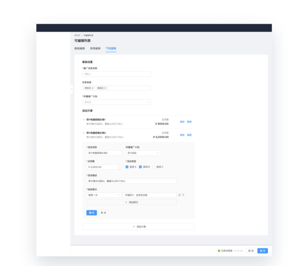 - 按類別劃分折疊面板(如 “基礎(chǔ)設(shè)置”“活動(dòng)方案”“排期規(guī)則”),默認(rèn)展開核心模塊,次要模塊可折疊;