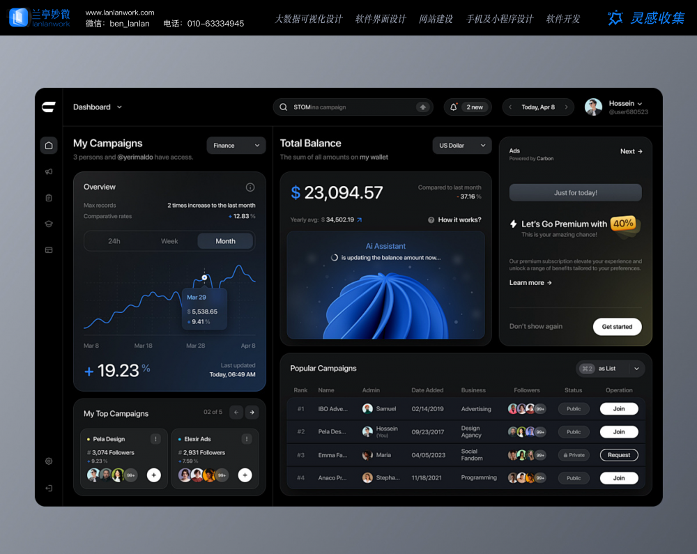 這 5 組界面都采用深色底色搭配低透明度肌理,和蘭亭妙微打造后臺(tái)管理系統(tǒng)首頁(yè)設(shè)計(jì)的思路高度契合。首圖企業(yè)服務(wù)首頁(yè)的深黑 + 淡紫漸變,既營(yíng)造出科技感,又不會(huì)讓視覺(jué)過(guò)于雜亂;加密貨幣后臺(tái)的暗紋處理,貼合區(qū)塊鏈業(yè)務(wù)屬性的同時(shí),還能讓核心數(shù)據(jù)更突出。