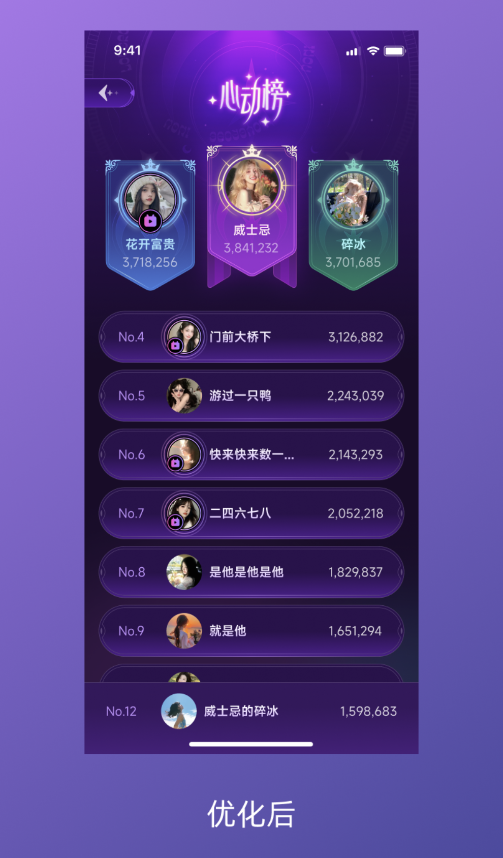 而優(yōu)化后的頁面完全煥然一新:前三名有了專屬視覺標識,信息層級清晰,主題風格統(tǒng)一,細節(jié)處的設(shè)計讓普通列表秒升高級感。其實這場 “逆襲” 并非依賴復雜設(shè)計,而是抓住了三個核心優(yōu)化方向,一步步讓界面煥發(fā)生機。