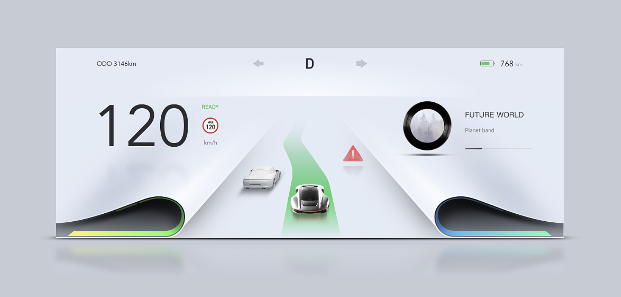 異形儀表的布局需打破傳統(tǒng)對(duì)稱思維,但不能犧牲易用性。首先明確核心功能模塊:新能源車需優(yōu)先呈現(xiàn)車速、電量、續(xù)航里程、能量回收狀態(tài);燃油車則側(cè)重轉(zhuǎn)速、時(shí)速、油量等。布局原則為 “核心信息優(yōu)先可視化”:將車速、電量等高頻查看信息置于視覺中心,導(dǎo)航、娛樂等輔助信息分布在邊緣區(qū)域,同時(shí)預(yù)留警告燈、故障提示等緊急信息的醒目位置??刹捎?“非對(duì)稱平衡” 布局,例如左側(cè)以動(dòng)態(tài)圖形呈現(xiàn)車速,右側(cè)以簡潔數(shù)字顯示續(xù)航,中間用貫穿式線條串聯(lián),既保持視覺協(xié)調(diào),又強(qiáng)化異形特質(zhì)。