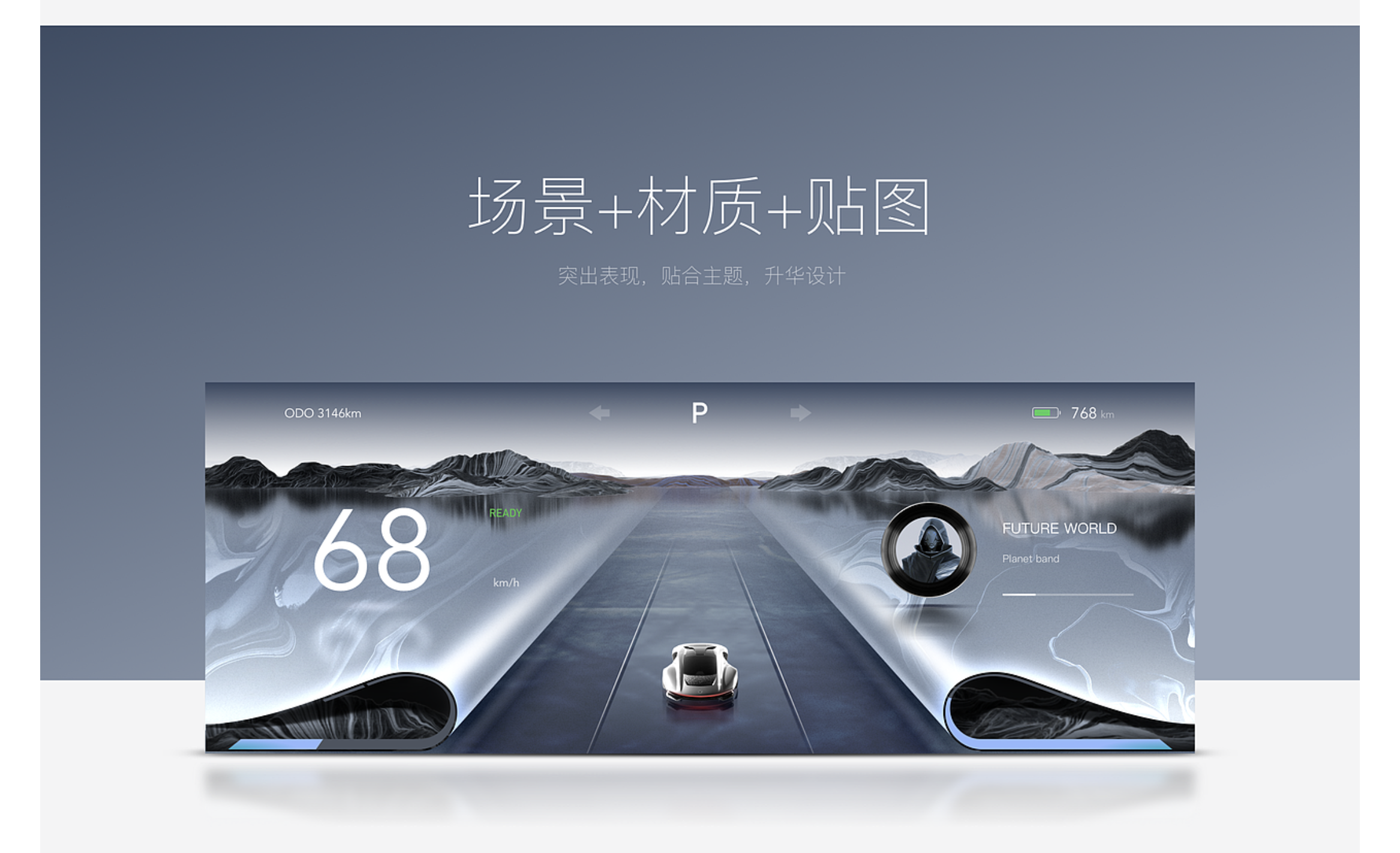 - 磨砂玻璃質(zhì)感:通過半透明效果與輕微顆粒感,營造簡約高級(jí)的科技感,適合未來座艙設(shè)計(jì),可應(yīng)用于儀表面板整體,搭配光影效果呈現(xiàn)通透感;