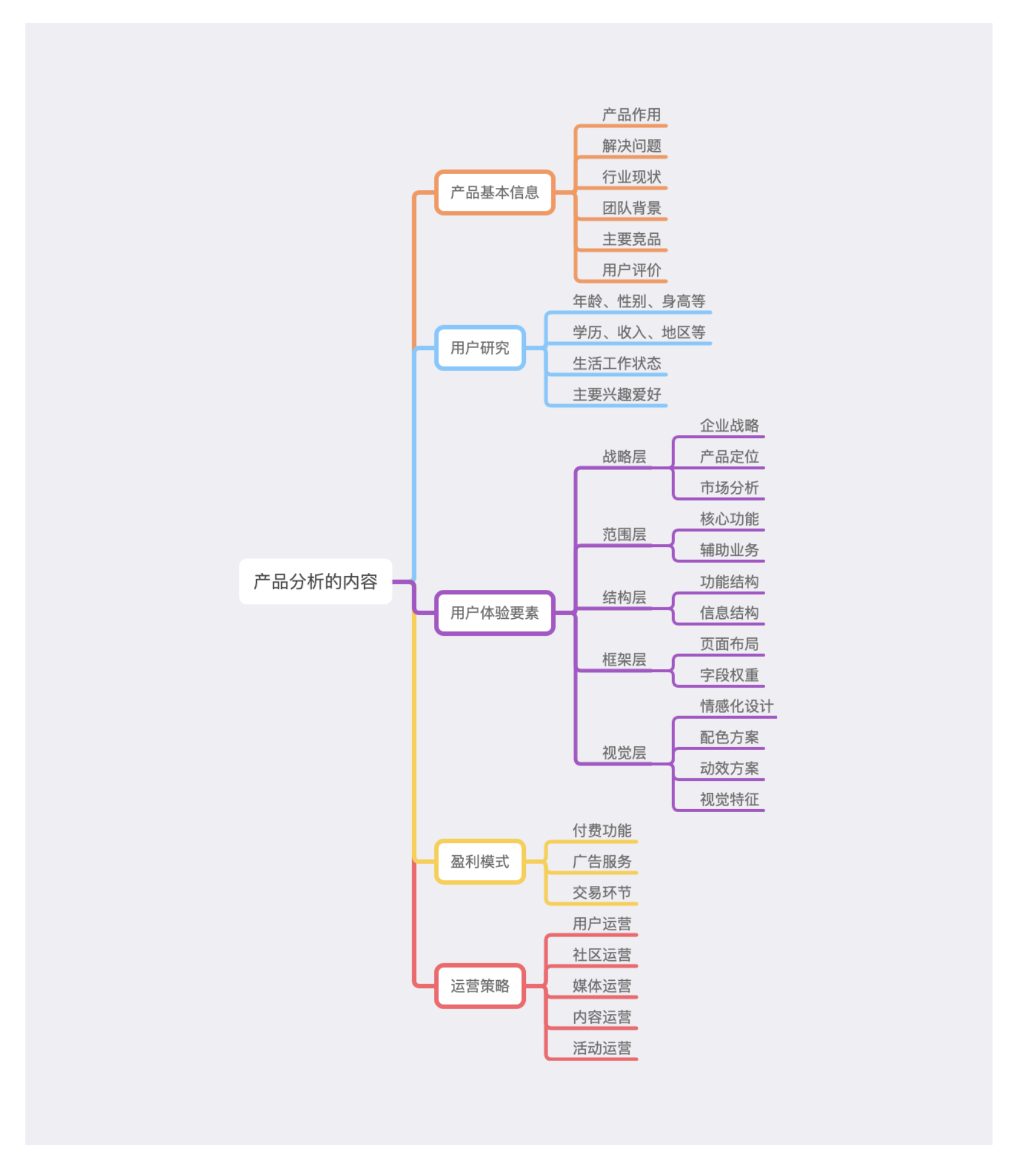 基于基礎(chǔ)信息,從 “用戶(hù)研究→用戶(hù)體驗(yàn)五要素→盈利模式→運(yùn)營(yíng)策略” 四個(gè)核心維度展開(kāi)分析,每個(gè)維度都需緊扣前期設(shè)定的目標(biāo)。
