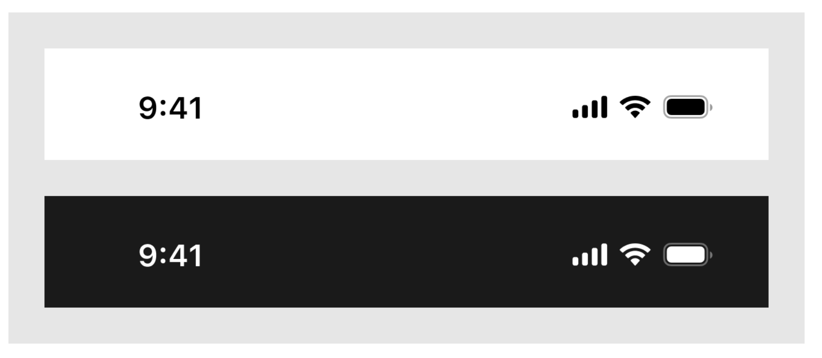 位于屏幕頂部邊緣,核心功能是展示設(shè)備狀態(tài)信息,包括時(shí)間、運(yùn)營商、電池電量等。豎屏模式下幾乎所有頁面強(qiáng)制顯示,僅全屏視頻、圖片等場景可暫時(shí)隱藏。狀態(tài)欄僅支持黑白兩色,選擇標(biāo)準(zhǔn)以 “與背景對比度最高” 為原則,iOS 會自動適配,設(shè)計(jì)師需避免設(shè)計(jì)稿中出現(xiàn)對比度不足的情況。
