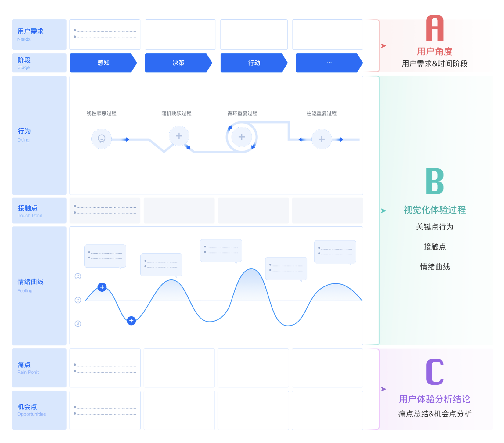 - 達(dá)成共識,降低溝通成本:通過可視化的地圖呈現(xiàn)痛點(diǎn)與機(jī)會點(diǎn),讓產(chǎn)品、設(shè)計(jì)、運(yùn)營、開發(fā)團(tuán)隊(duì)對優(yōu)化方向形成統(tǒng)一認(rèn)知,避免主觀判斷帶來的分歧,讓工作更有針對性。