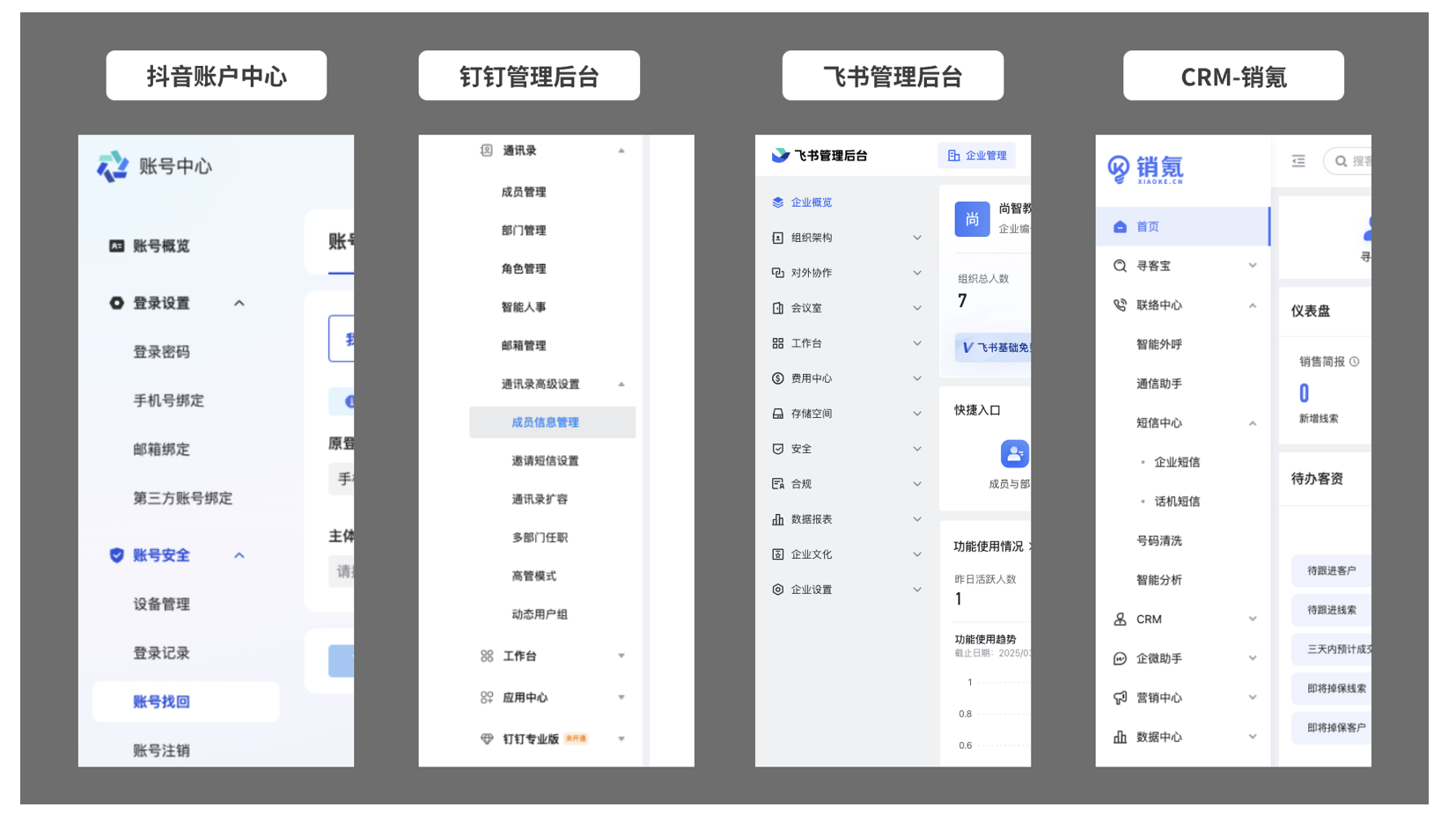 適用場景:高頻操作多、需要全局搜索 / 消息提醒的中大型 B 端產品,如飛書后臺、釘釘管理后臺、抖音電商羅盤。