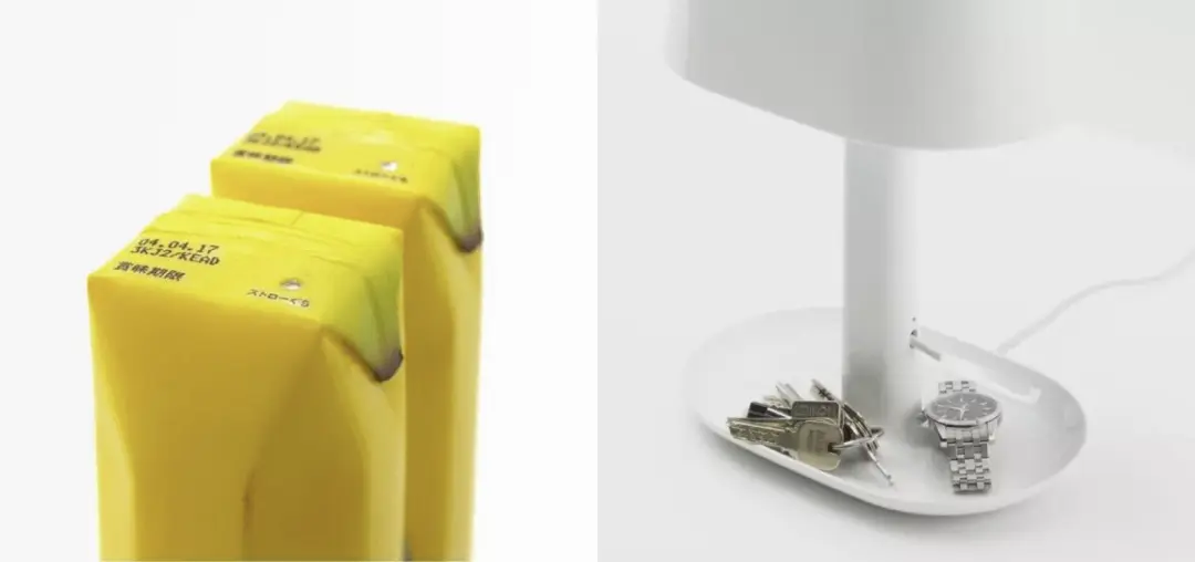 深澤直人的兩個經(jīng)典設計,完美詮釋了這種潛臺詞:一款香蕉汁飲品,無需任何文字說明,僅憑香蕉造型的瓶身,就能讓用戶立刻知曉產(chǎn)品屬性,傳遞出 “這是香蕉汁” 的潛臺詞;一款臺燈的底座被設計成托盤造型,使用者會自然而然地將鑰匙、手表等隨身小物放置其上,因為底座的形態(tài)傳遞出 “可以盛放小物件” 的提示。