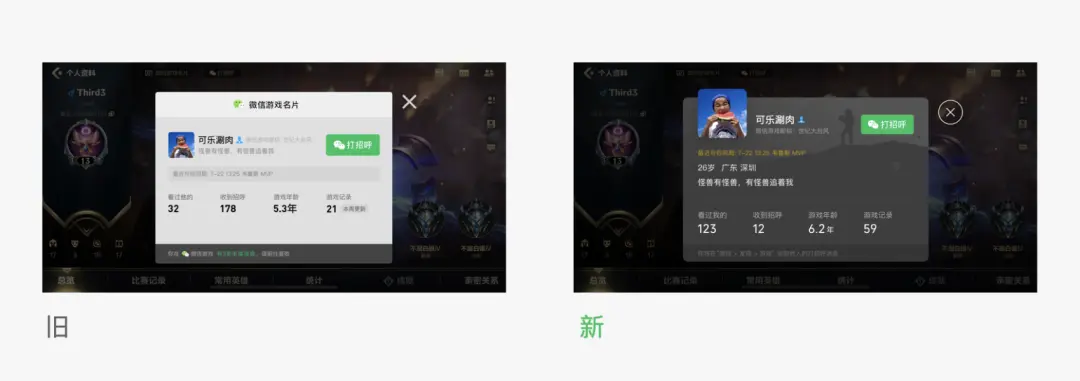 而最初的微信游戲名片,采用明亮清晰的設計風格,其潛臺詞更偏向 “高效、冷靜的平臺功能工具”。游戲界面與名片界面的潛臺詞形成強烈反差,這正是用戶覺得違和、生硬的核心原因 —— 視覺潛臺詞的割裂,打破了玩家的游戲沉浸感。