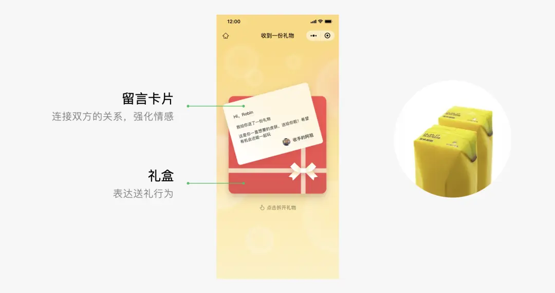 基于此,我將 “禮盒” 與 “留言卡片” 抽象為核心 UI 元素:禮盒直觀表達 “送禮” 的行為,傳遞 “這是一份用心準備的禮物” 的潛臺詞;寫有雙方昵稱與留言的卡片,連接起送禮者與收禮者的關系,強化情感共鳴。將這兩個元素融入核心的 “拆禮物” 頁面,即便用戶不看界面文字,也能立刻感知到 “有朋友為我送上了一份心意滿滿的禮物”,讓情感傳遞更直接、更動人。