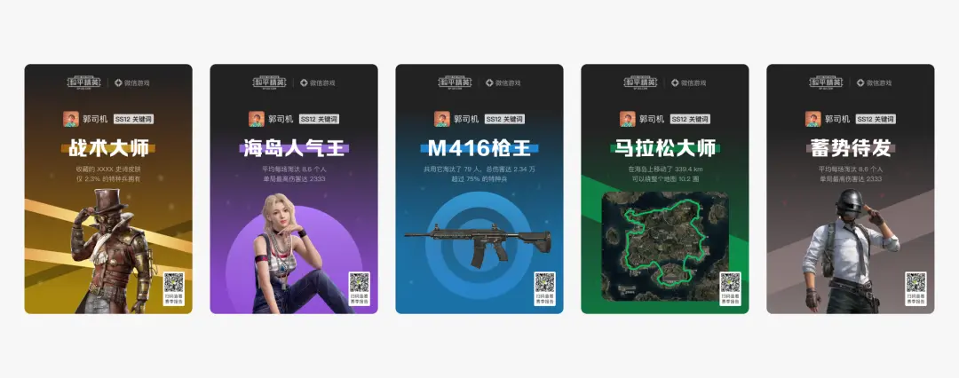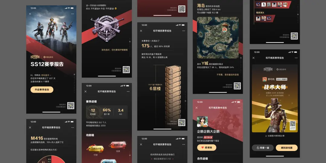 第三個案例,是和平精英 S12 賽季戰(zhàn)報的設計。賽季戰(zhàn)報的核心功能,是回顧玩家在賽季中的游戲表現(xiàn),而設計的核心挑戰(zhàn)是:如何將冰冷、復雜的游戲數(shù)據(jù),轉化為直觀、易懂的內容,讓玩家能快速感知自身的游戲成果,進而產(chǎn)生分享欲望。