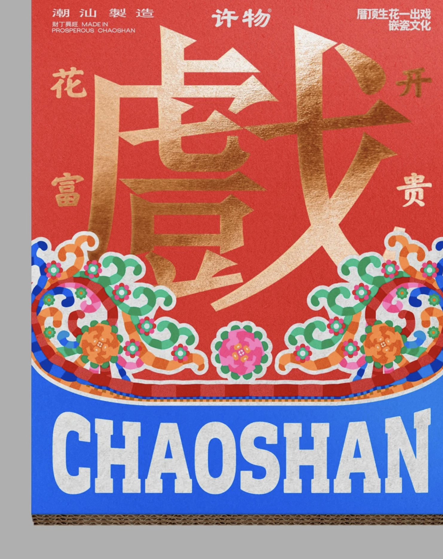 在非遺與民俗元素的運用上,他聚焦潮汕獨有的嵌瓷、木雕、英歌舞等文化瑰寶。嵌瓷作為潮汕 “厝頂生花” 的百年老手藝,以彩色碎瓷片在屋頂拼出龍飛鳳舞、人物典故的鮮活畫面,經(jīng)風雨而不褪色,成為他設計中反復運用的核心元素;潮汕傳統(tǒng)木雕以 “一毫米一毫米雕刻出的主權(quán)” 詮釋著匠心,其精巧的紋樣與豐富的象征意義,為設計增添了濃厚的文化質(zhì)感;英歌舞作為潮汕非遺代表,其剛勁的舞姿、鮮明的人物形象,也成為設計中彰顯潮汕精神的重要符號。此外,“財丁興旺”“富貴滿堂”“神明保號” 等潮汕民間最質(zhì)樸的美好祝愿,以及 “膠己人”“閑來看戲” 等極具地域特色的方言與生活場景,也被融入設計之中,讓文創(chuàng)作品充滿潮汕的煙火氣與人情味。