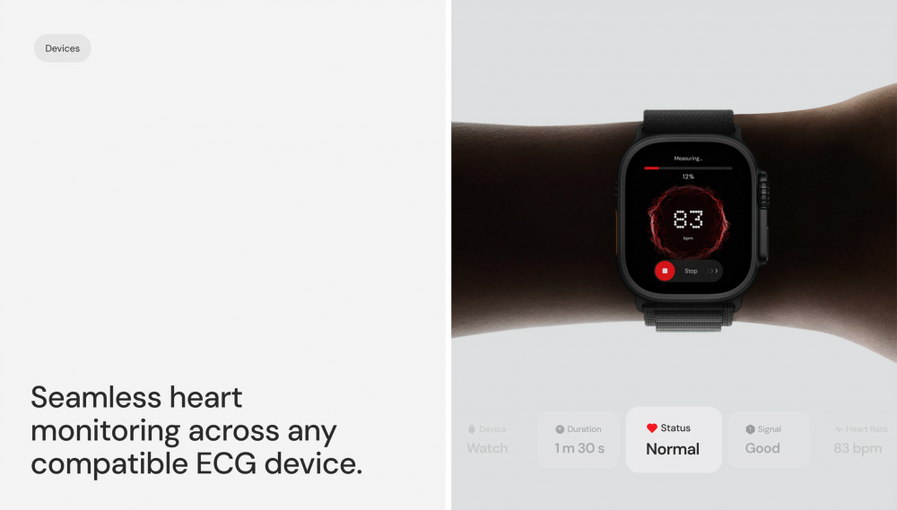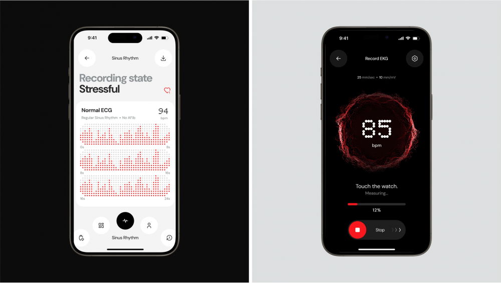 - 狀態(tài)反饋:左側(cè)界面清晰標(biāo)注 “Stressful” 狀態(tài)與 “Normal ECG” 結(jié)論,右側(cè)測(cè)量頁(yè)以粒子動(dòng)效強(qiáng)化實(shí)時(shí)感,配合進(jìn)度條與操作按鈕,讓用戶清晰感知測(cè)量進(jìn)程,降低醫(yī)療類產(chǎn)品的使用焦慮。