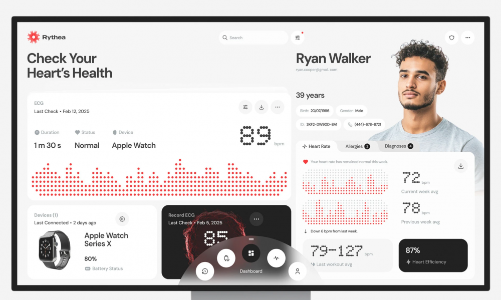這是一組來(lái)自網(wǎng)絡(luò)的 Rythea 心電健康監(jiān)測(cè) App 設(shè)計(jì)案例,覆蓋手機(jī)、手表、桌面端全場(chǎng)景,我們結(jié)合北京蘭亭妙微(藍(lán)藍(lán)設(shè)計(jì))在醫(yī)療健康類產(chǎn)品的 UI/UX 設(shè)計(jì)經(jīng)驗(yàn),對(duì)其進(jìn)行專業(yè)解讀與賞析。