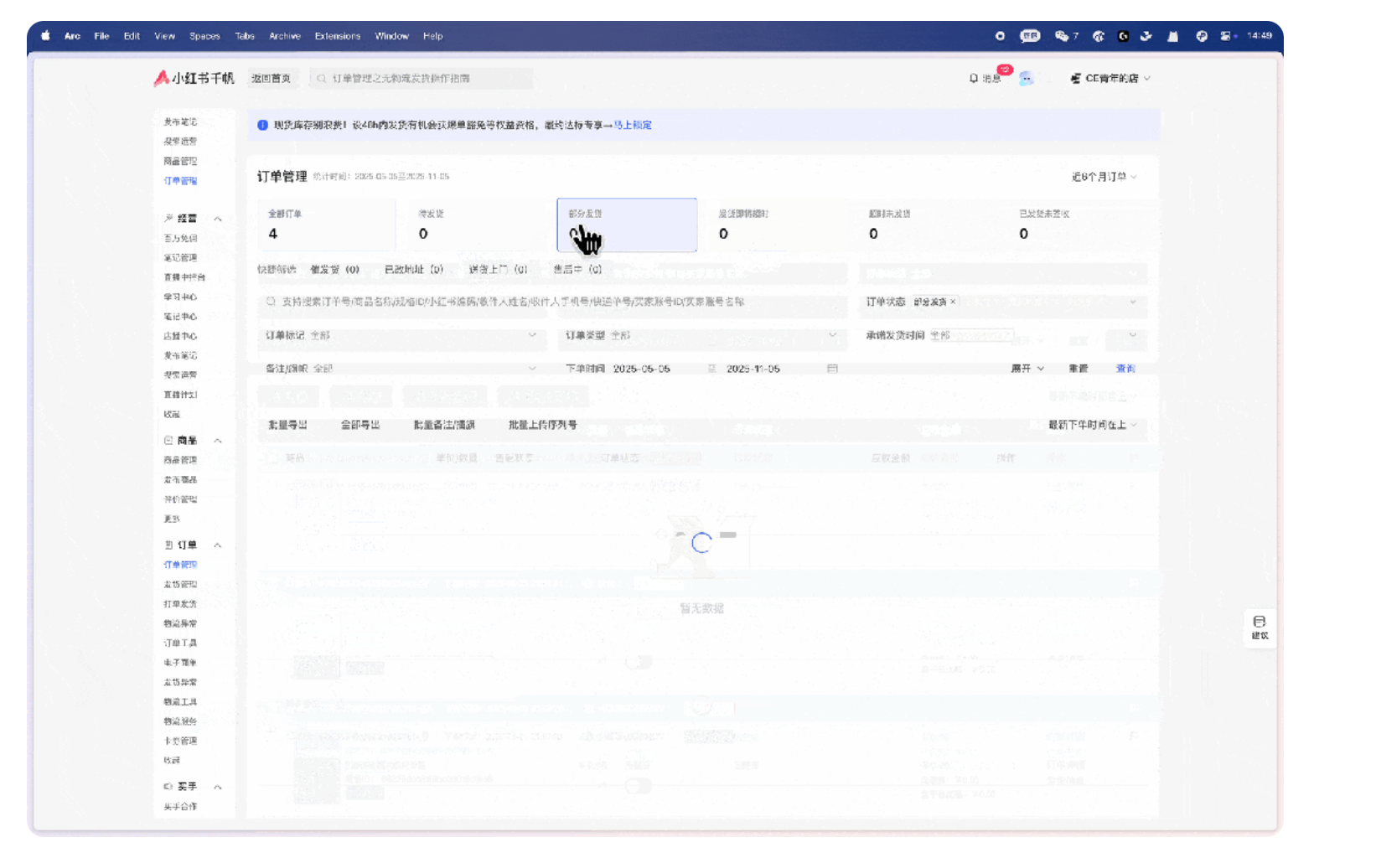 比如我想外露的內(nèi)容是各種狀態(tài),我就可以將其放在頂部,進(jìn)行指標(biāo)圖+篩選功能的雜糅,像在小紅書千帆系統(tǒng)當(dāng)中,對(duì)于訂單的多種狀態(tài),就會(huì)使用這一技巧,進(jìn)行呈現(xiàn)。