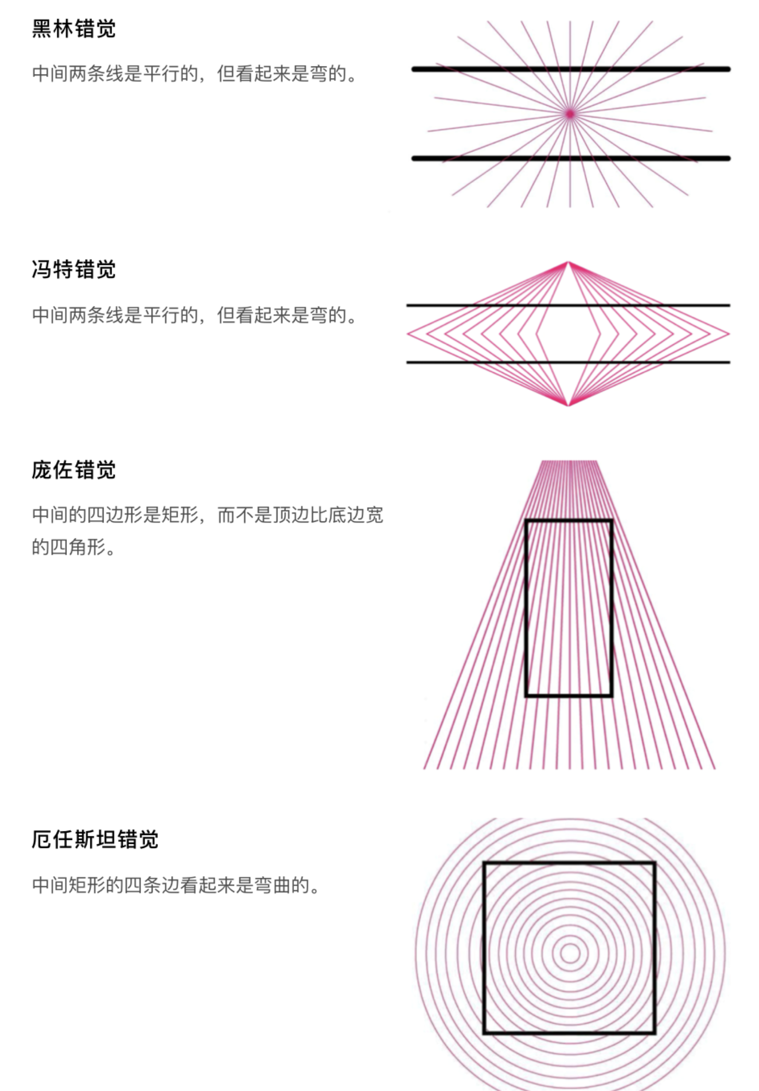 - 幾何感知錯(cuò)覺:黑林錯(cuò)覺、馮特錯(cuò)覺中平行線條看似彎曲,龐佐錯(cuò)覺中矩形看似頂寬底窄,厄任斯坦錯(cuò)覺中矩形邊框看似彎曲,這些錯(cuò)覺提醒我們,在設(shè)計(jì)直線型界面元素(如邊框、分割線、按鈕)時(shí),需通過適度的視覺調(diào)整抵消錯(cuò)覺影響,保證界面規(guī)整性;菲克錯(cuò)覺、垂直水平錯(cuò)覺中,等長(zhǎng)的垂直線段比水平線段視覺上更長(zhǎng),繆勒萊爾錯(cuò)覺中末端斜線朝向影響線段長(zhǎng)度感知,這一規(guī)律常被用于按鈕、輸入框的尺寸設(shè)計(jì),讓界面元素在視覺上達(dá)到平衡。