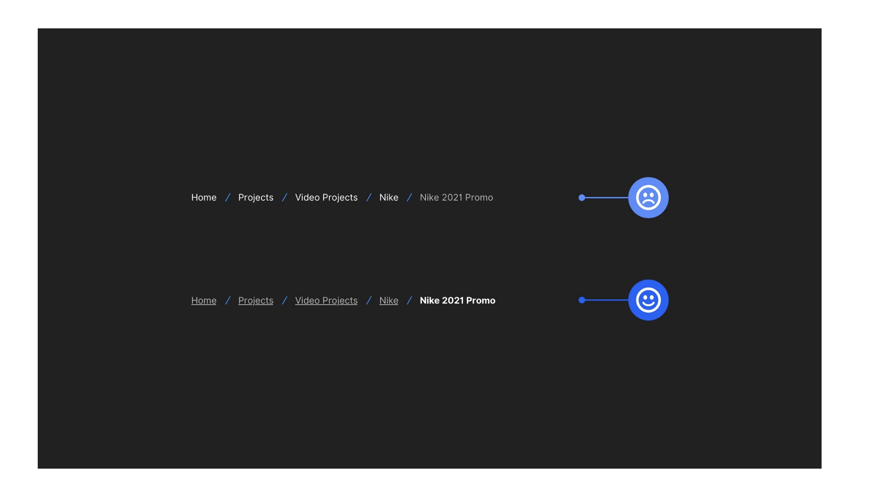 面包屑導航的核心價值是 “定位” 與 “回溯”,設計時需通過細節(jié)讓導航邏輯更清晰。可將導航中 “當前所在位置” 的文本做視覺強化 —— 比如加深顏色、加大字重、調(diào)整字號,與其他導航節(jié)點形成明顯區(qū)分;同時簡化導航層級,避免過多節(jié)點造成視覺雜亂,讓用戶一眼就能明確自己在界面中的位置,以及可回溯的路徑。