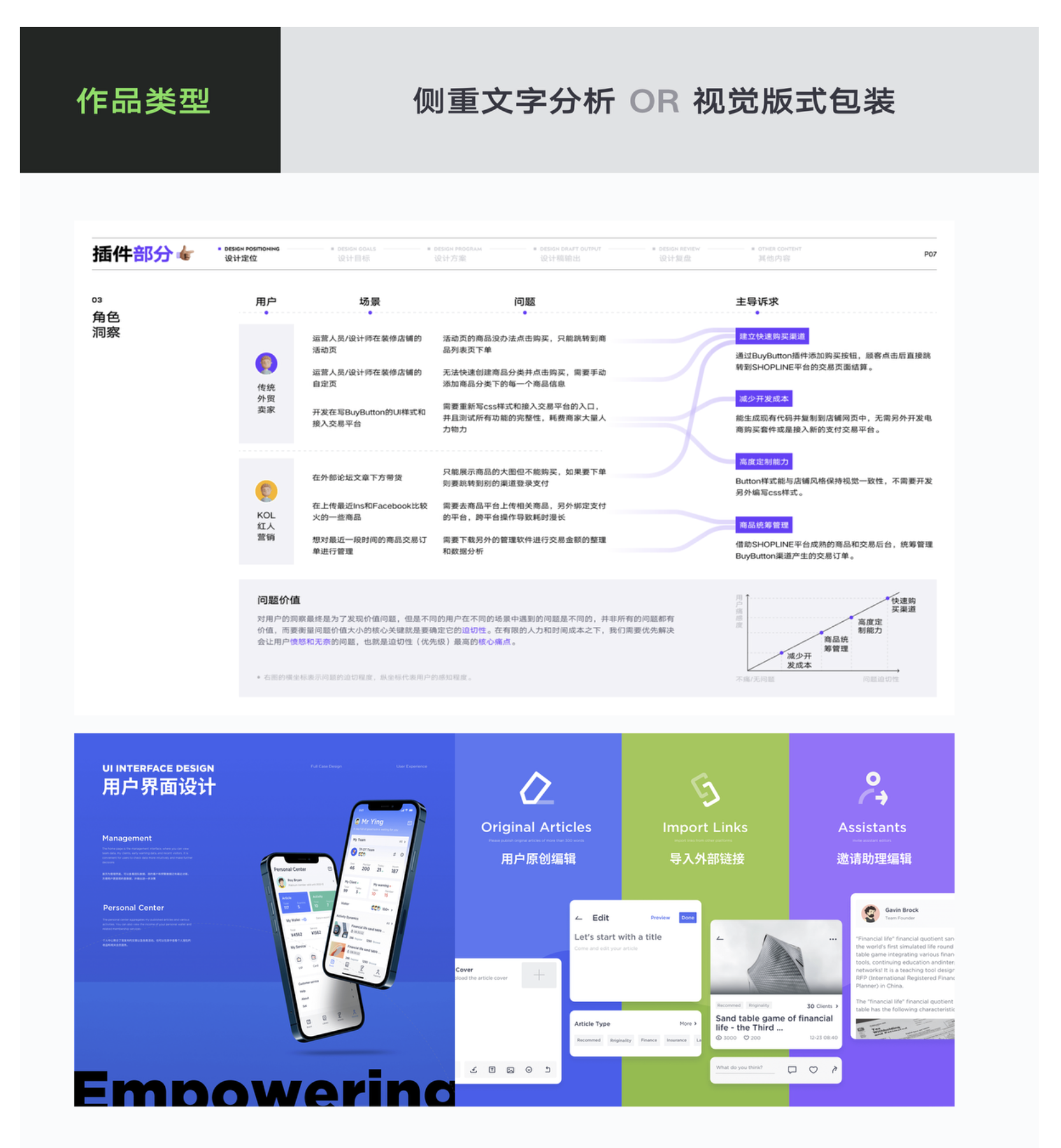 如果你擅長視覺設(shè)計,版式、色彩、細(xì)節(jié)把控能力突出,那么可以把作品集的重點放在視覺包裝上,推理分析簡單梳理即可,用視覺驚艷打動面試官;如果你設(shè)計思維強(qiáng),擅長發(fā)現(xiàn)問題、解決問題,那么可以側(cè)重推理分析的深度,用邏輯體現(xiàn)專業(yè);如果兩者都擅長,那就將視覺與分析結(jié)合,這是最理想的狀態(tài)。