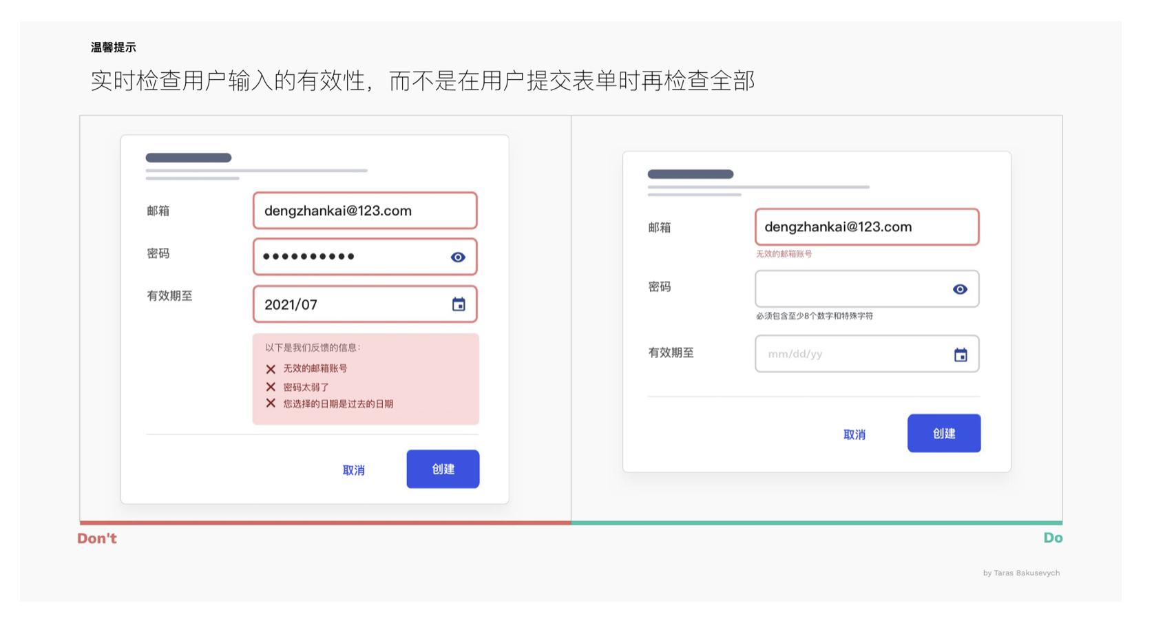 - 避免「提前校驗(yàn)」,即在用戶未完成輸入時(shí),不隨意標(biāo)記字段為無(wú)效,防止引發(fā)用戶的焦慮感;