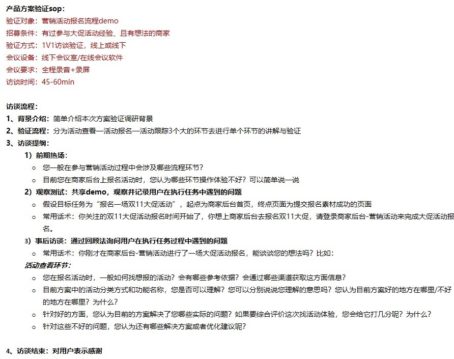 可用性測試的基礎(chǔ)是任務(wù),任務(wù)測試內(nèi)容的好壞是能夠?qū)y試結(jié)果的準(zhǔn)確性有直接影響的。因此在招募用戶之前,需要對測試的產(chǎn)品方案進(jìn)行任務(wù)設(shè)計(jì)。比如,測試商家在 B 端營銷系統(tǒng)報(bào)名營銷活動(dòng)流程方案的任務(wù)可以是:報(bào)名一場雙 11 大促活動(dòng)。