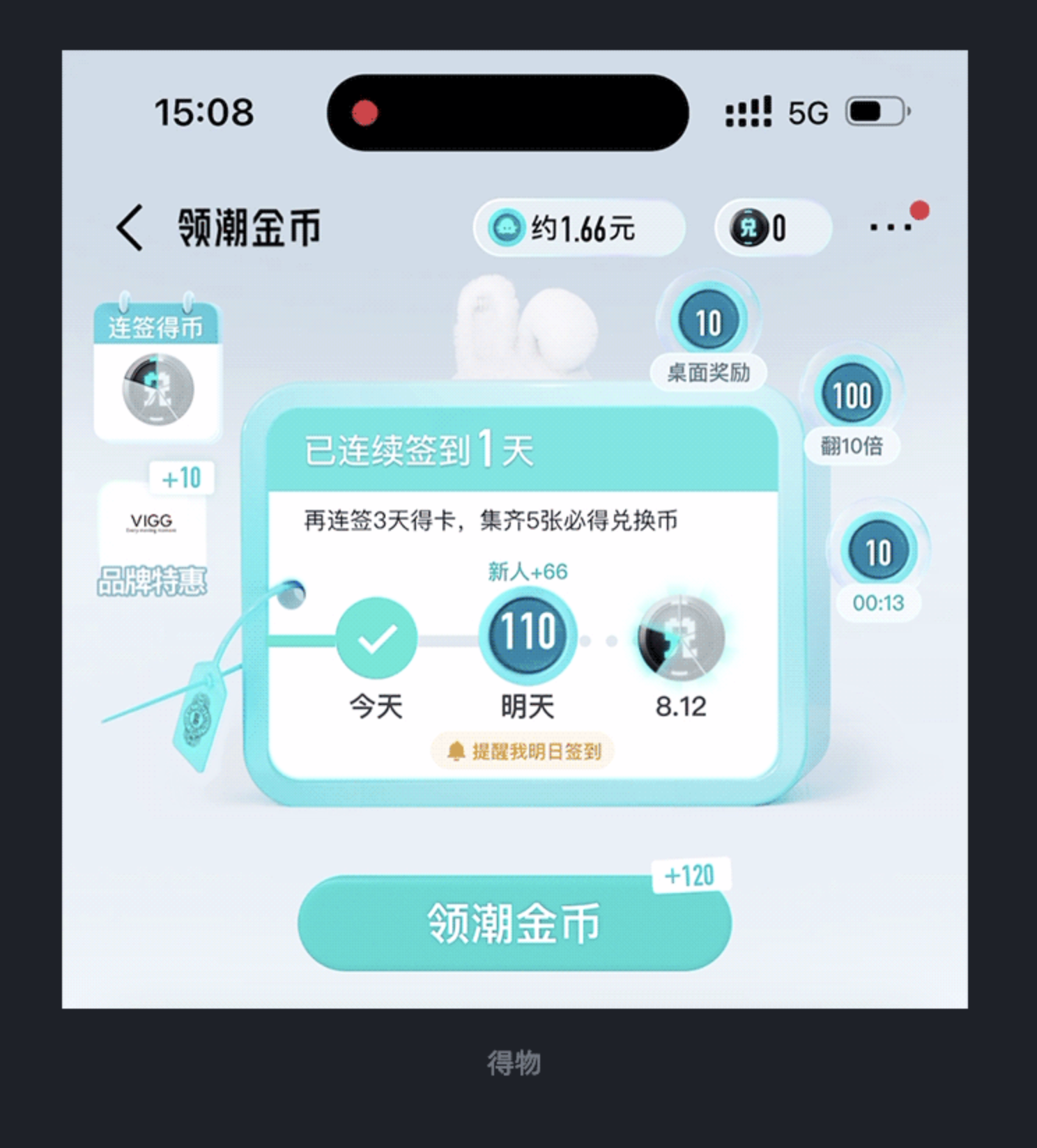 - 簽到中:流暢形變、獎勵彈出、進度點亮;