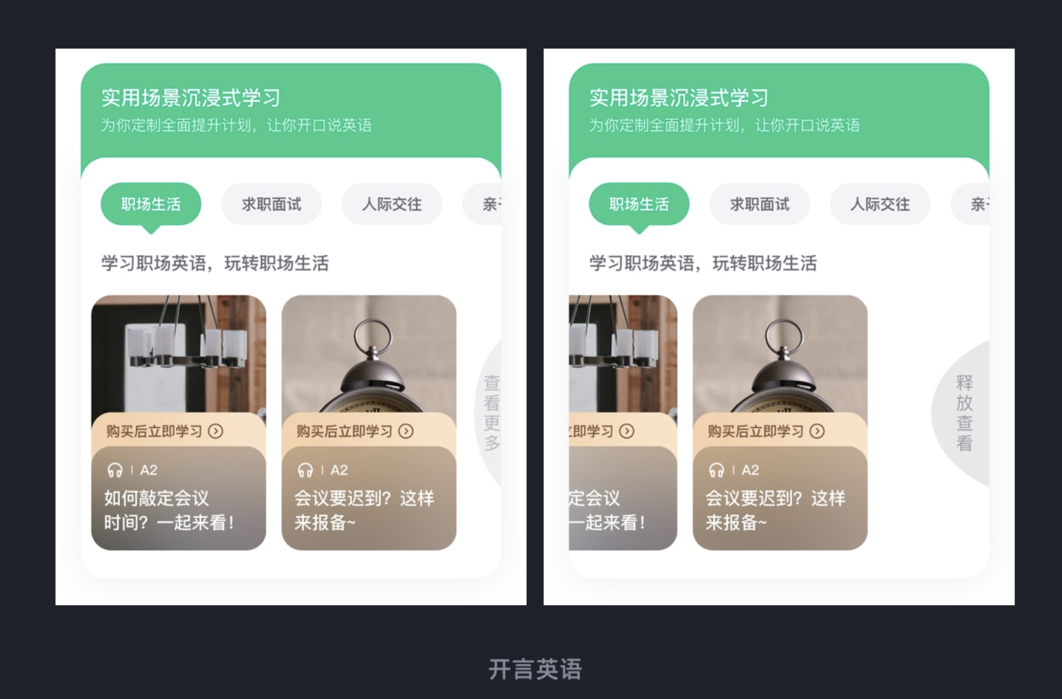 在橫向卡片流中,用戶滑動到臨界位置時,給出「查看更多 / 釋放查看」提示,松手直接進(jìn)入詳情頁,省去二次點(diǎn)擊。