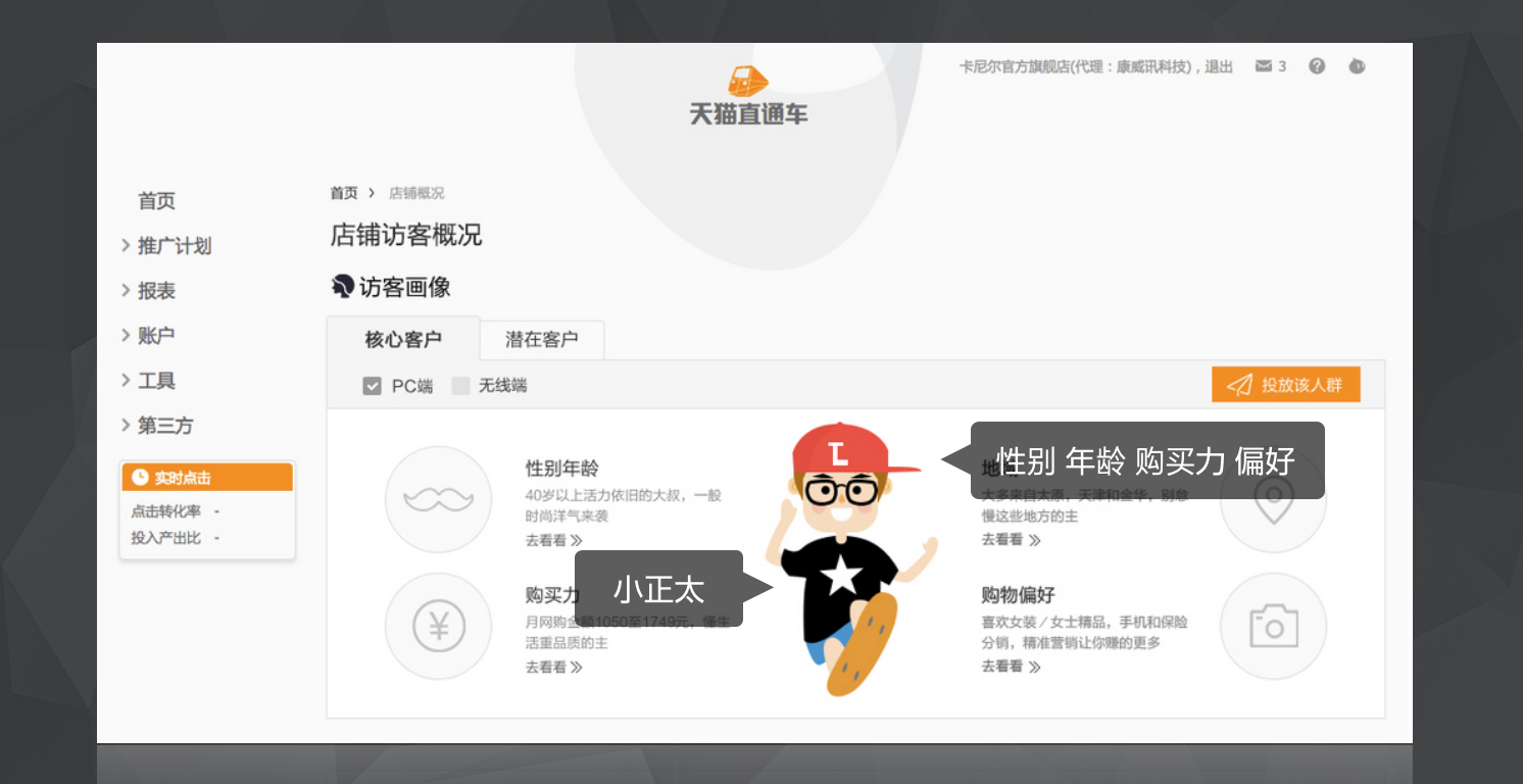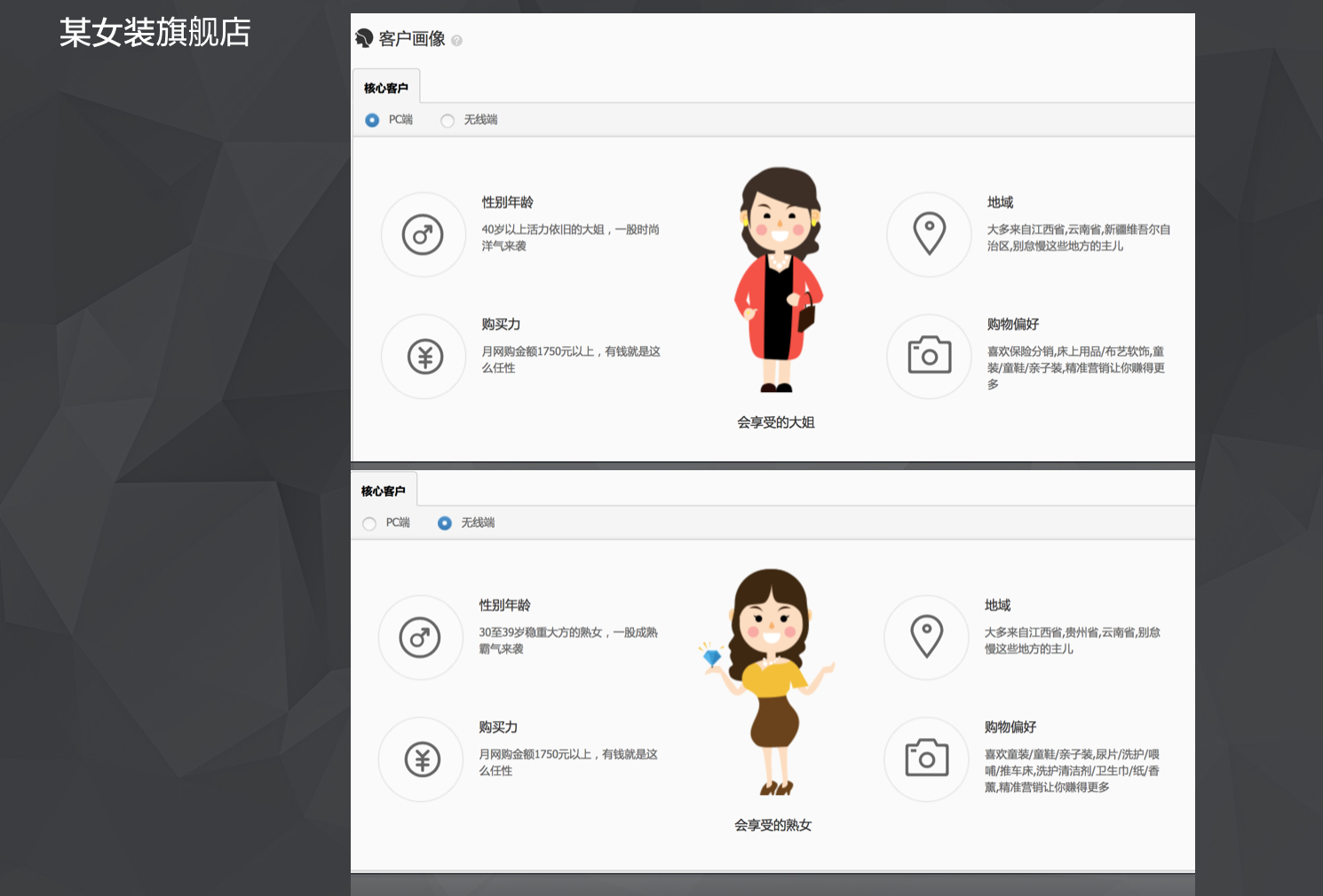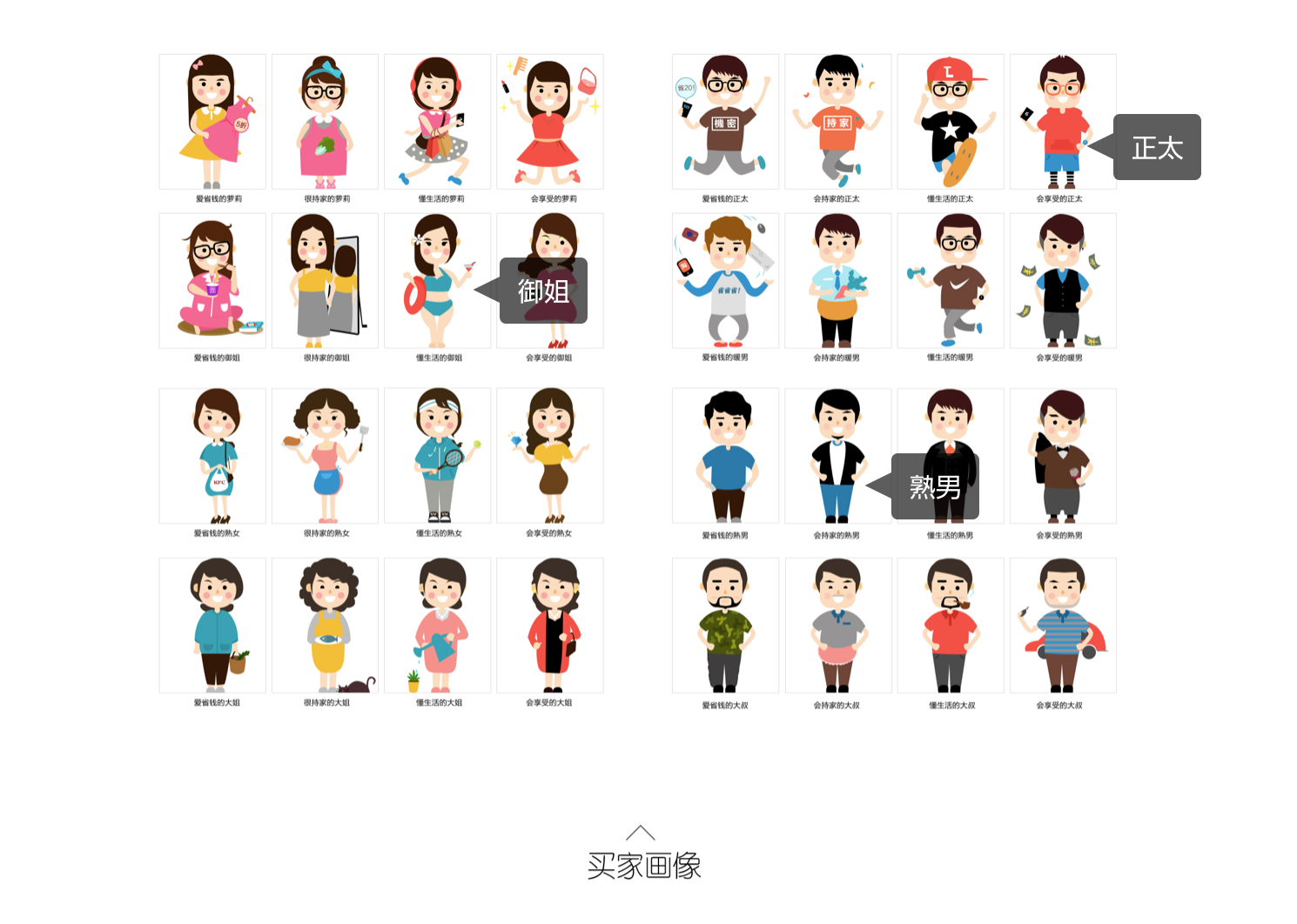 通過(guò)購(gòu)買(mǎi)力,性別,年齡,偏好4個(gè)緯度來(lái)將訪客劃分為不同的類(lèi)型,用手繪的形式來(lái)代替文案,讓用戶(hù)在短時(shí)間內(nèi)更容易的了解到到店訪客的情況。