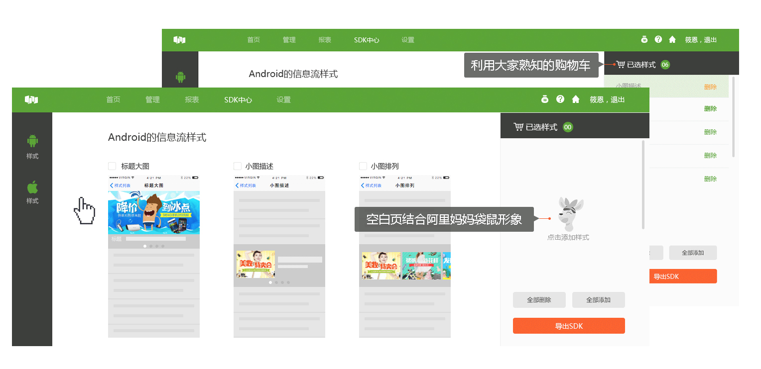 在新品介紹中加入了阿里媽媽袋鼠的品牌形象,一方面做到了,品牌的滲透。阿里媽媽袋鼠吉祥物在PC產(chǎn)品端落地的,另一方面可以通過(guò)帶有表情的卡通形象,傳達(dá)給用戶(hù)相關(guān)的信息。