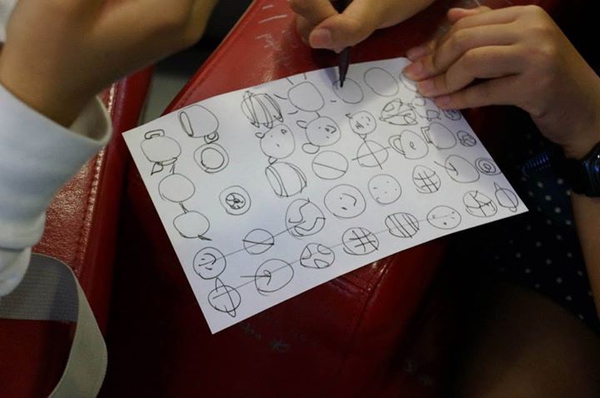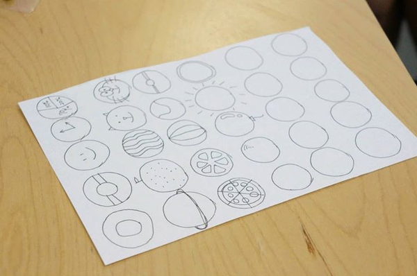 (這是在做頭腦風(fēng)暴前的小練習(xí),畫30個(gè)圓圈,然后盡可能地把每一個(gè)圓圈都賦予一個(gè)意義,變成不同的物件,這個(gè)聯(lián)系在很多關(guān)于頭腦風(fēng)暴的工作坊里都有,Photo by Tatsuhiro Ohtani,VIA同事)