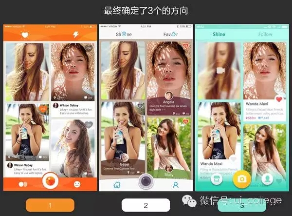 最后如上圖,根據(jù)評審我們選出了票數(shù)最高的三個不同風(fēng)格的方案,理論上我們認(rèn)為這三個方案都是正確的、內(nèi)部達成一致、且都符合我們在『情感關(guān)鍵詞』 和『情緒板』分析時『陽光溫暖年輕』的設(shè)計目標(biāo)。但是三個是不同風(fēng)格各有千秋,而且我們都挺喜歡的,要怎么抉擇呢?最后就要試探一下用戶的感覺了。