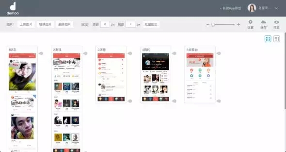 Demoo支持我們對圖片進(jìn)行拖動排序整理,在標(biāo)題欄區(qū)域鼠標(biāo)停留,即可發(fā)現(xiàn)鼠標(biāo)指針變?yōu)槭中?,此時可拖動頁面。友情提示:按照app主tab邏輯擺放頁面,后面建立tab跳轉(zhuǎn)時,會更輕松哦!