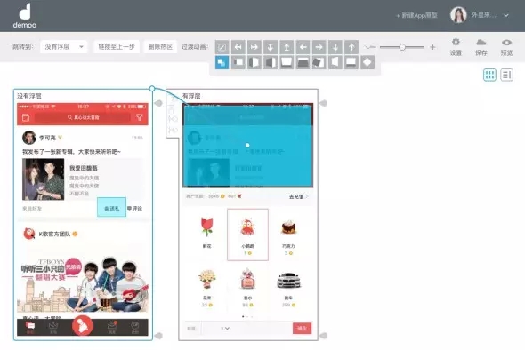 最后,聽說很多試用過的朋友都在詢問,如何在Demoo中模擬浮層的效果,Demoo其實(shí)更擅長的是頁面之間的跳轉(zhuǎn),那么如何模擬呢?這里給大家一個小技巧。