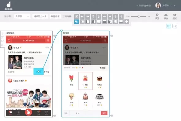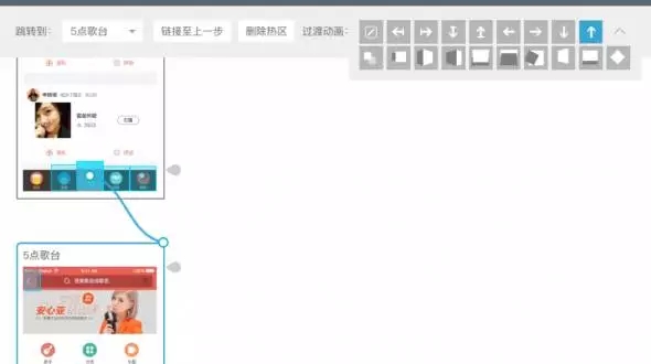 真實(shí)的app中,頁面間常常通過方向來示意層級關(guān)系,例如重新創(chuàng)建的流程,通常創(chuàng)建頁面會從底部向上呼起,于是,在建立熱區(qū)鏈接過程時,我們需要對鏈接進(jìn)行方向設(shè)定。如圖示,我將點(diǎn)歌臺呼起的頁面出現(xiàn)形式,設(shè)定為從下往上出。如果不是很確定切換效果,Demoo很細(xì)心的在這里設(shè)計(jì)了動畫預(yù)覽,鼠標(biāo)停留在小方塊上時,會有微動畫示意,多看幾遍也就明白了。