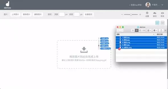 在設(shè)計(jì)工具中,我已經(jīng)設(shè)計(jì)好了全民K歌5個主要頁面的圖并命名好保存在文件夾中,準(zhǔn)備開始制作原型。如圖所示,Demoo支持批量導(dǎo)入圖片,將我需要的圖片全部選中,拖放到虛框內(nèi),即可完成圖片導(dǎo)入工作。導(dǎo)入后,就相當(dāng)于你已經(jīng)把a(bǔ)pp原材料都放到工作臺啦,之后操作起來就會特別方便。