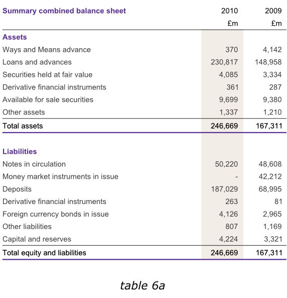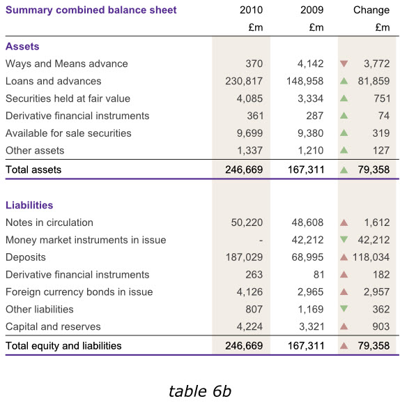 在英格蘭銀行2010年度報(bào)告中,盡管我們不能通過改變數(shù)據(jù)來達(dá)到讀者的期望,但是在其他同樣的報(bào)告中,我們在末尾增加一列有用的數(shù)據(jù),以避免用戶在比較各年度數(shù)據(jù)的時(shí)候,還需要自行計(jì)算增長或減少的幅度。下面第一個(gè)表格6a已經(jīng)增加了總資產(chǎn)和總負(fù)債數(shù)據(jù),而表格6b則在右側(cè)增加了新的一列,使我們更容易分析出哪些領(lǐng)域的經(jīng)營成果發(fā)生了實(shí)質(zhì)性變動(dòng)。