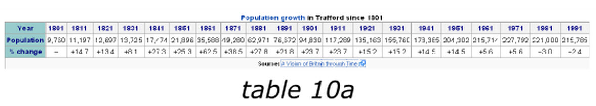 當(dāng)我們在撰寫wikipedia上的Trafford條目時(shí),有一個(gè)1801至1991年的人口變化表格10a,他包含有2行20列,讀者必須記住有關(guān)信息,并且不停的對照表頭和數(shù)值來確認(rèn)他們的關(guān)系,否則他們就無法獲得趨勢信息。